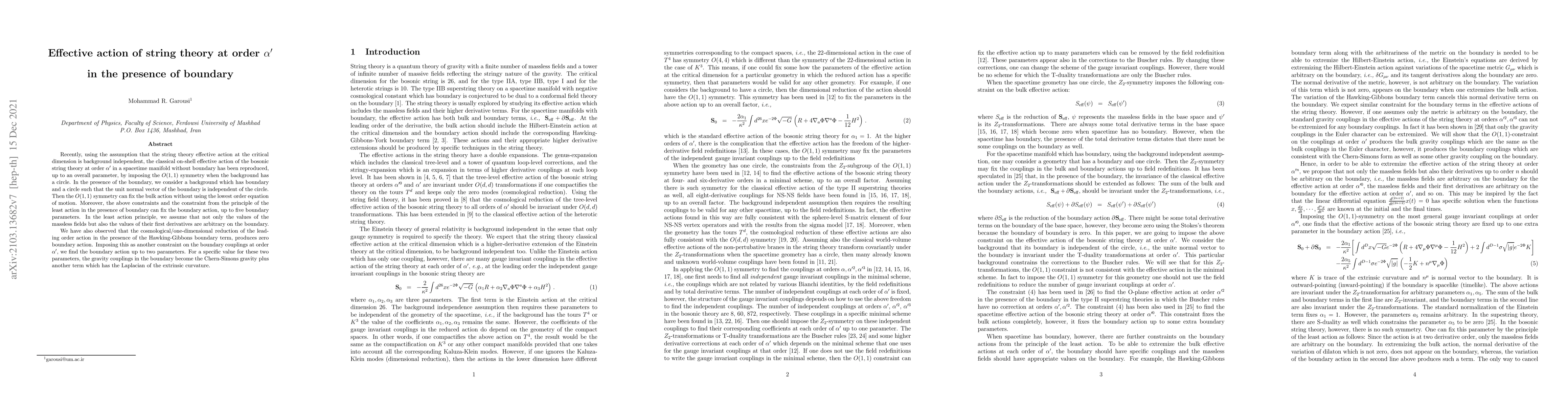 Recently, using the assumption that the string theory effective action at the critical dimension is background independent, the classical on-shell effective action of the bosonic string theory at order $\alpha'$ in a spacetime manifold without boundary has been reproduced, up to an overall parameter, by imposing the $O(1,1)$ symmetry when the background has a circle. In the presence of the boundary, we consider a background which has boundary and a circle such that the unit normal vector of the boundary is independent of the circle. Then the $O(1,1)$ symmetry can fix the bulk action without using the lowest order equation of motion. Moreover, the above constraints and the constraint from the principle of the least action in the presence of boundary can fix the boundary action, up to five boundary parameters. In the least action principle, we assume that not only the values of the massless fields but also the values of their first derivatives are arbitrary on the boundary. We have also observed that the cosmological/one-dimensional reduction of the leading order action in the presence of the Hawking-Gibbons boundary term, produces zero boundary action. Imposing this as another constraint on the boundary couplings at order $\alpha'$, we find the boundary action up to two parameters. For a specific value for these two parameters, the gravity couplings in the boundary become the Chern-Simons gravity plus another term which has the Laplacian of the extrinsic curvature.
