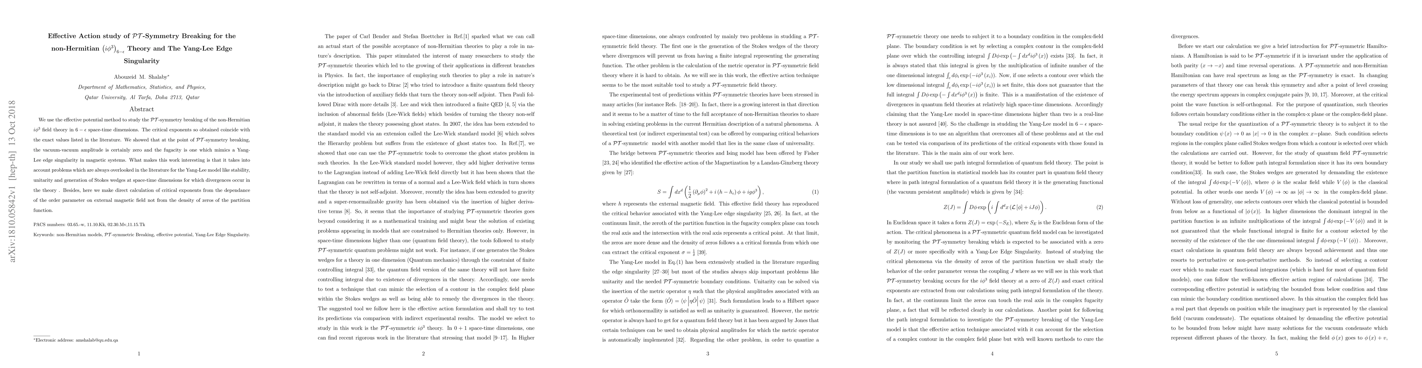 We use the effective potential method to study the $\mathcal{PT}$-symmetry breaking of the non-Hermitian $i\phi^{3}$ field theory in $6-\epsilon$ space-time dimensions. The critical exponents so obtained coincide with the exact values listed in the literature. We showed that at the point of $\mathcal{PT}$-symmetry breaking, the vacuum-vacuum amplitude is certainly zero and the fugacity is one which mimics a Yang-Lee edge singularity in magnetic systems. What makes this work interesting is that it takes into account problems which are always overlooked in the literature for the Yang-Lee model like stability, unitarity and generation of Stokes wedges at space-time dimensions for which divergences occur in the theory . Besides, here we make direct calculation of critical exponents from the dependance of the order parameter on external magnetic field not from the density of zeros of the partition function.