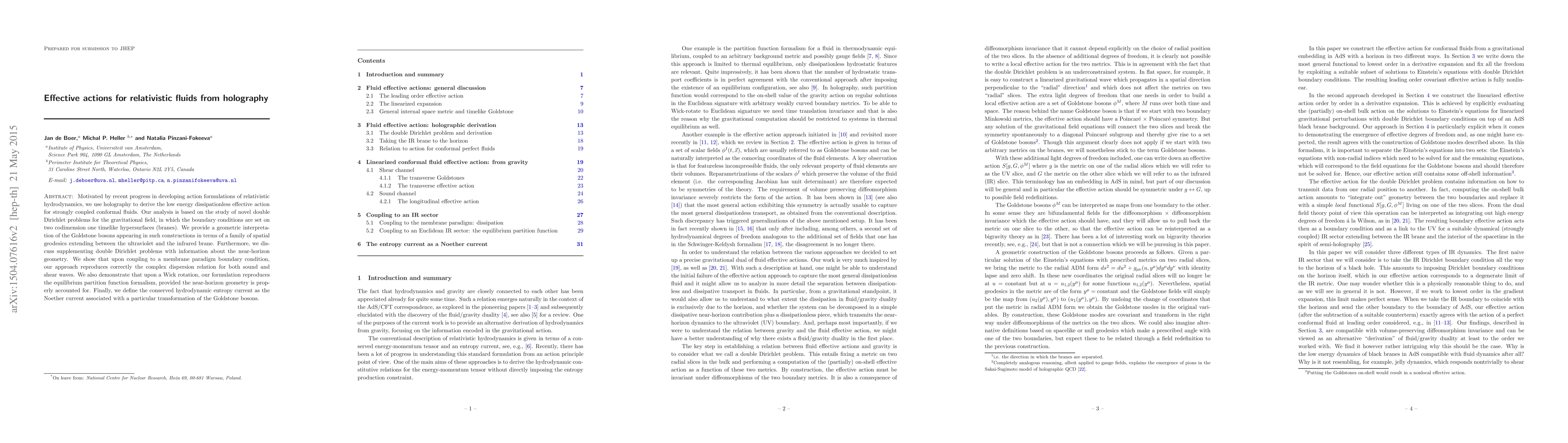 Motivated by recent progress in developing action formulations of relativistic hydrodynamics, we use holography to derive the low energy dissipationless effective action for strongly coupled conformal fluids. Our analysis is based on the study of novel double Dirichlet problems for the gravitational field, in which the boundary conditions are set on two codimension one timelike hypersurfaces (branes). We provide a geometric interpretation of the Goldstone bosons appearing in such constructions in terms of a family of spatial geodesics extending between the ultraviolet and the infrared brane. Furthermore, we discuss supplementing double Dirichlet problems with information about the near-horizon geometry. We show that upon coupling to a membrane paradigm boundary condition, our approach reproduces correctly the complex dispersion relation for both sound and shear waves. We also demonstrate that upon a Wick rotation, our formulation reproduces the equilibrium partition function formalism, provided the near-horizon geometry is properly accounted for. Finally, we define the conserved hydrodynamic entropy current as the Noether current associated with a particular transformation of the Goldstone bosons.