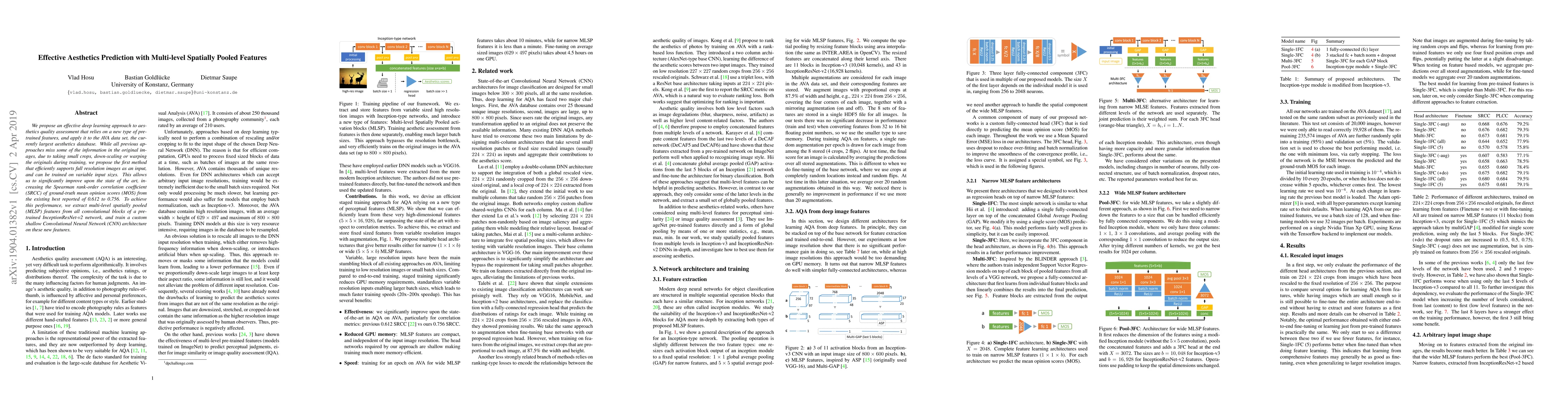 This paper introduces a deep learning method for aesthetics quality assessment using multi-level spatially pooled features from a pre-trained InceptionResNet-v2 network, achieving state-of-the-art performance on the AVA data set by improving the Spearman rank-order correlation coefficient from 0.612 to 0.756. The approach supports full resolution images and variable input sizes.