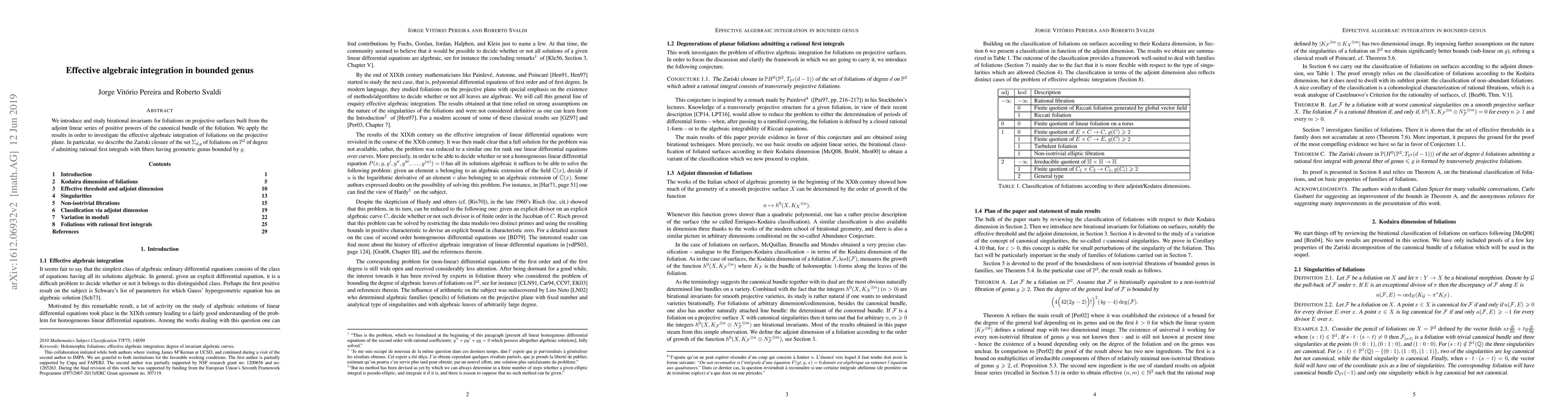 We introduce and study birational invariants for foliations on projective surfaces built from the adjoint linear series of positive powers of the canonical bundle of the foliation. We apply the results in order to investigate the effective algebraic integration of foliations on the projective plane. In particular, we describe the Zariski closure of the set of foliations on the projective plane of degree d admitting rational first integrals with fibers having geometric genus bounded by g.