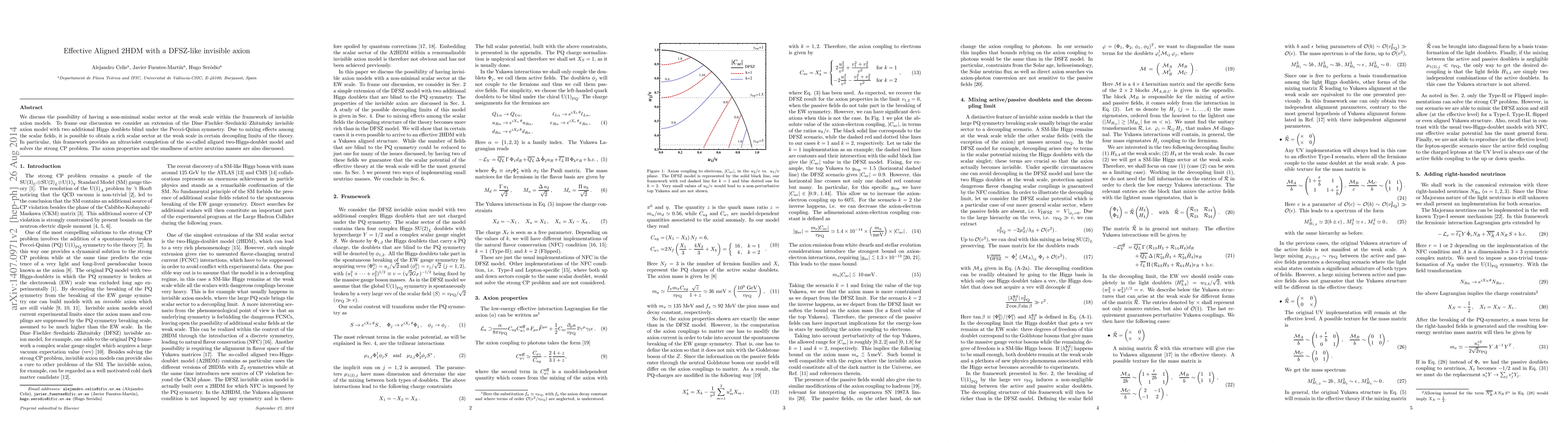 We discuss the possibility of having a non-minimal scalar sector at the weak scale within the framework of invisible axion models. To frame our discussion we consider an extension of the Dine-Fischler-Srednicki-Zhitnitsky invisible axion model with two additional Higgs doublets blind under the Peccei-Quinn symmetry. Due to mixing effects among the scalar fields, it is possible to obtain a rich scalar sector at the weak scale in certain decoupling limits of the theory. In particular, this framework provides an ultraviolet completion of the so-called aligned two-Higgs-doublet model and solves the strong CP problem. The axion properties and the smallness of active neutrino masses are also discussed.