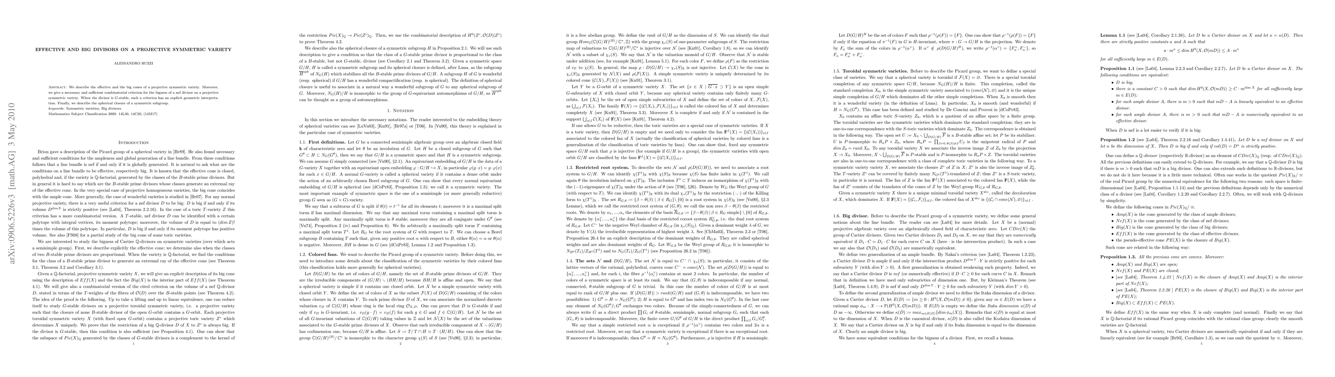 We describe the effective and the big cones of a projective symmetric variety. Moreover, we give a necessary and sufficient combinatorial criterion for the bigness of a nef divisor on a projective symmetric variety. When the variety is toroidal and the divisor is $G$-stable, such criterion has an explicit geometric interpretation. Finally, we describe the spherical closure of a symmetric subgroup.