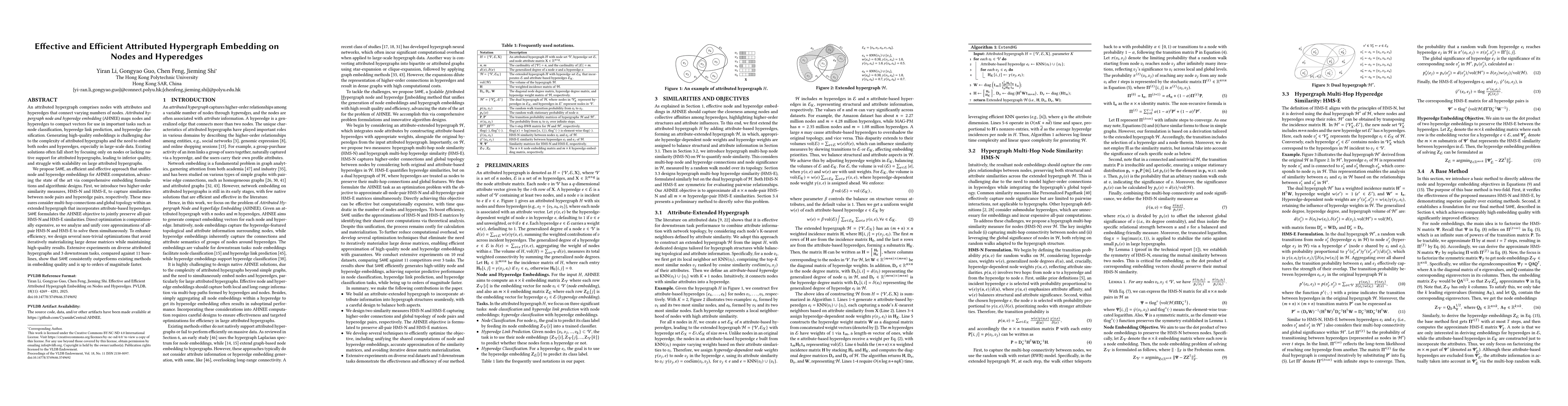 An attributed hypergraph comprises nodes with attributes and hyperedges that connect varying numbers of nodes. Attributed hypergraph node and hyperedge embedding (AHNEE) maps nodes and hyperedges to compact vectors for use in important tasks such as node classification, hyperedge link prediction, and hyperedge classification. Generating high-quality embeddings is challenging due to the complexity of attributed hypergraphs and the need to embed both nodes and hyperedges, especially in large-scale data. Existing solutions often fall short by focusing only on nodes or lacking native support for attributed hypergraphs, leading to inferior quality, and struggle with scalability on large attributed hypergraphs. We propose SAHE, an efficient and effective approach that unifies node and hyperedge embeddings for AHNEE computation, advancing the state of the art via comprehensive embedding formulations and algorithmic designs. First, we introduce two higher-order similarity measures, HMS-N and HMS-E, to capture similarities between node pairs and hyperedge pairs, respectively. These measures consider multi-hop connections and global topology within an extended hypergraph that incorporates attribute-based hyperedges. SAHE formulates the AHNEE objective to jointly preserve all-pair HMS-N and HMS-N similarities. Direct optimization is computationally expensive, so we analyze and unify core approximations of all-pair HMS-N and HMS-N to solve them simultaneously. To enhance efficiency, we design several non-trivial optimizations that avoid iteratively materializing large dense matrices while maintaining high-quality results. Extensive experiments on diverse attributed hypergraphs and 3 downstream tasks, compared against 11 baselines, show that SAHE consistently outperforms existing methods in embedding quality and is up to orders of magnitude faster.