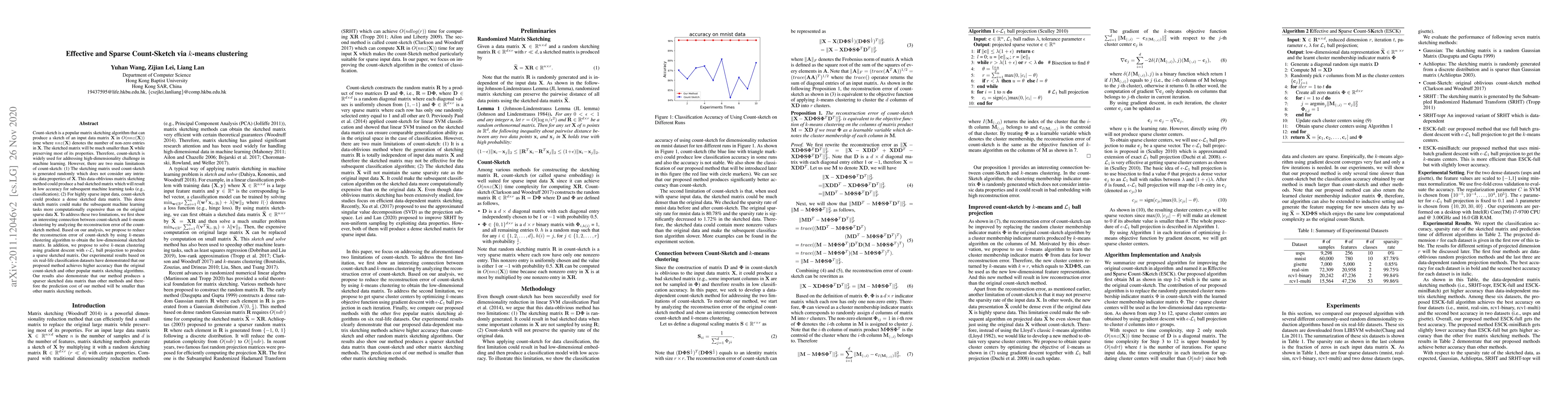 This paper proposes an effective and sparse count-sketch method using k-means clustering to address the limitations of traditional count-sketch, which generates a random sketching matrix and can produce dense sketches for sparse data. The method leverages k-means clustering to reduce reconstruction error and gradient descent with -L1 ball projection for sparser sketches, achieving higher accuracy and lower computational cost on classification tasks.