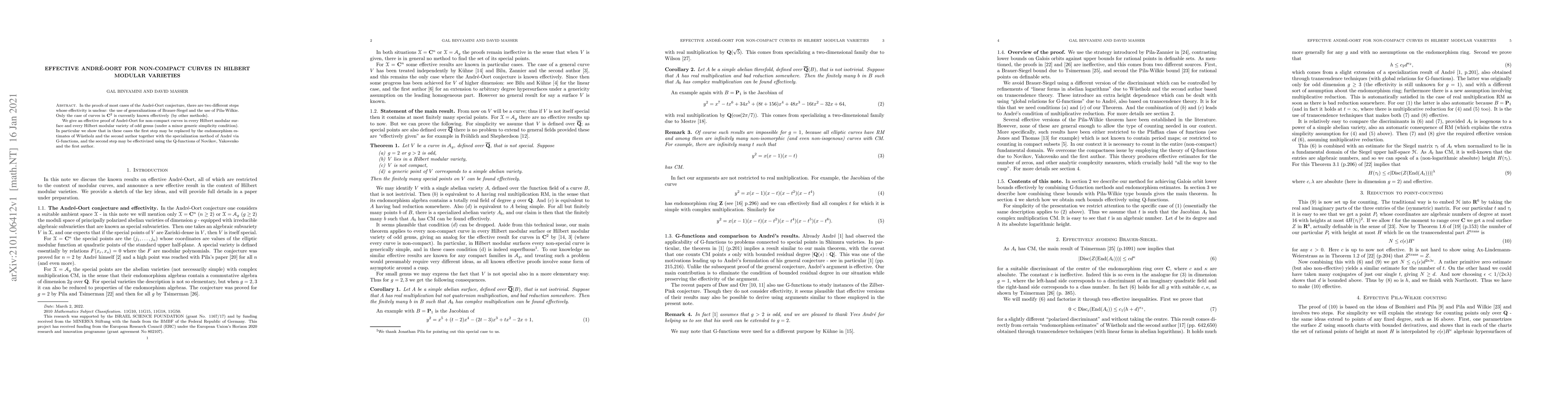 In the proofs of most cases of the Andr\'e-Oort conjecture, there are two different steps whose effectivity is unclear: the use of generalizations of Brauer-Siegel and the use of Pila-Wilkie. Only the case of curves in ${\bf C}^2$ is currently known effectively (by other methods). We give an effective proof of Andr\'e-Oort for non-compact curves in every Hilbert modular surface and every Hilbert modular variety of odd genus (under a minor generic simplicity condition). In particular we show that in these cases the first step may be replaced by the endomorphism estimates of W\"ustholz and the second author together with the specialization method of Andr\'e via G-functions, and the second step may be effectivized using the Q-functions of Novikov, Yakovenko and the first author.