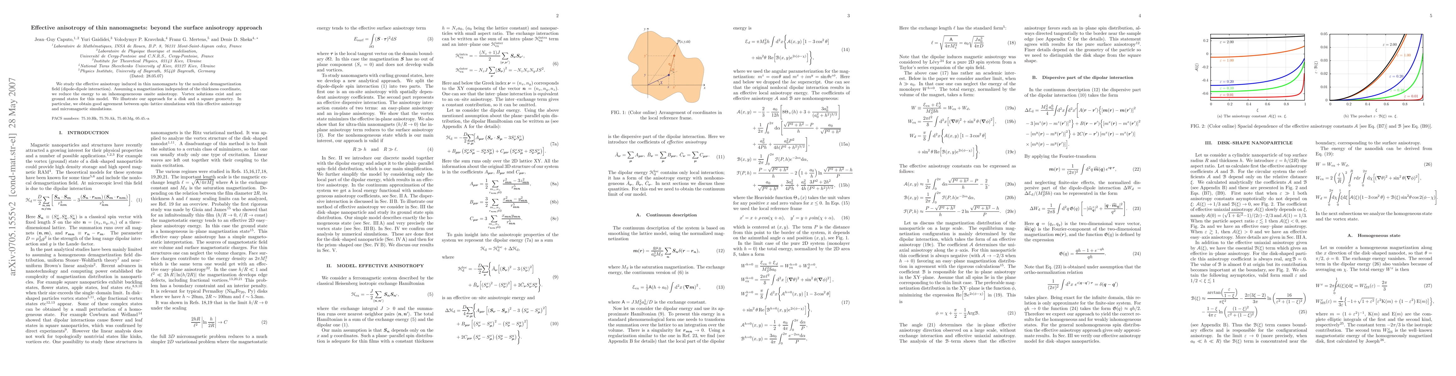 We study the effective anisotropy induced in thin nanomagnets by the nonlocal demagnetization field (dipole-dipole interaction). Assuming a magnetization independent of the thickness coordinate, we reduce the energy to an inhomogeneneous onsite anisotropy. Vortex solutions exist and are ground states for this model. We illustrate our approach for a disk and a square geometry. In particular, we obtain good agreement between spin-lattice simulations with this effective anisotropy and micromagnetic simulations.