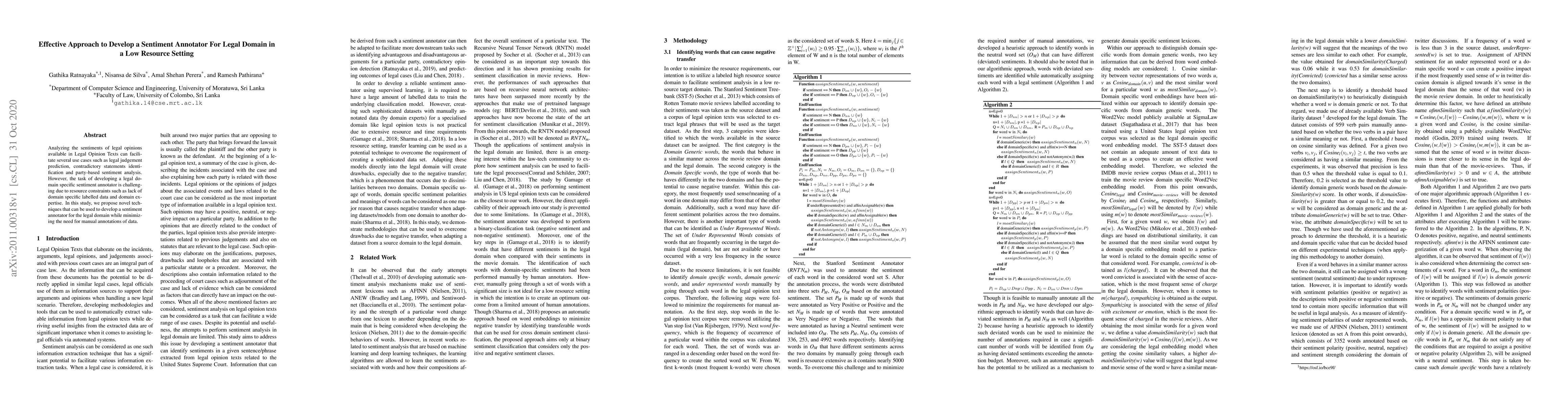 This paper proposes innovative methods to develop a sentiment annotator for legal domain texts in low-resource settings, aiming to minimize the need for manual data annotation by leveraging available resources. The techniques focus on facilitating use cases such as legal judgment prediction and contradictory statement identification.