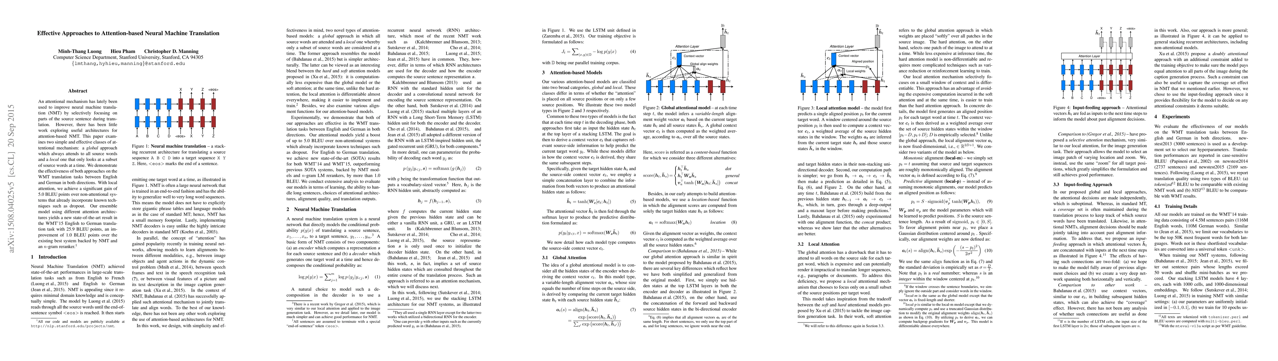 An attentional mechanism has lately been used to improve neural machine translation (NMT) by selectively focusing on parts of the source sentence during translation. However, there has been little work exploring useful architectures for attention-based NMT. This paper examines two simple and effective classes of attentional mechanism: a global approach which always attends to all source words and a local one that only looks at a subset of source words at a time. We demonstrate the effectiveness of both approaches over the WMT translation tasks between English and German in both directions. With local attention, we achieve a significant gain of 5.0 BLEU points over non-attentional systems which already incorporate known techniques such as dropout. Our ensemble model using different attention architectures has established a new state-of-the-art result in the WMT'15 English to German translation task with 25.9 BLEU points, an improvement of 1.0 BLEU points over the existing best system backed by NMT and an n-gram reranker.