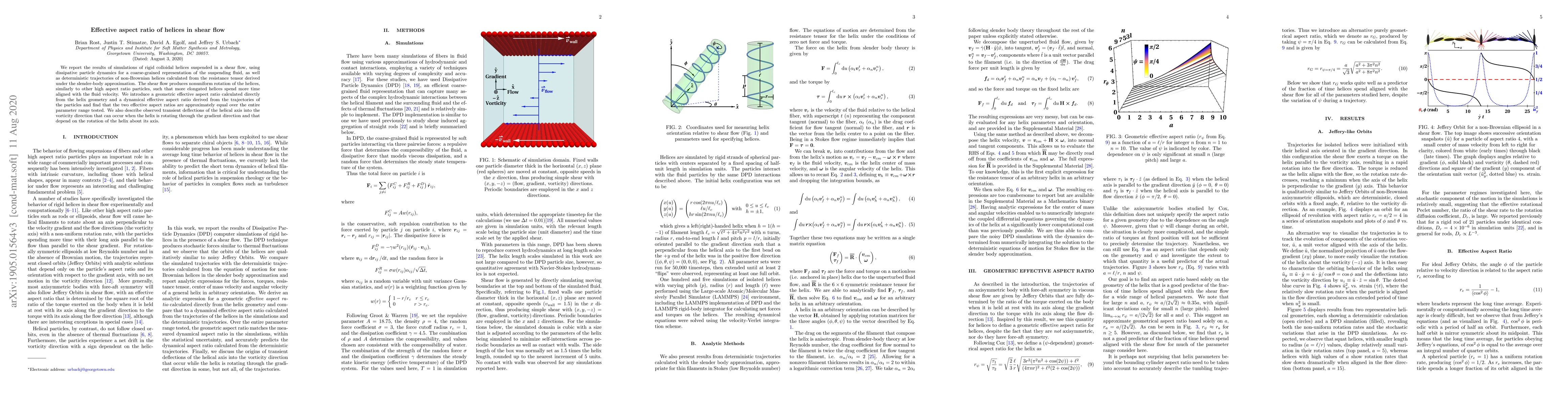 We report the results of simulations of rigid colloidal helices suspended in a shear flow, using dissipative particle dynamics for a coarse-grained representation of the suspending fluid, as well as deterministic trajectories of non-Brownian helices calculated from the resistance tensor derived under the slender-body approximation. The shear flow produces nonuniform rotation of the helices, similarly to other high aspect ratio particles, such that more elongated helices spend more time aligned with the fluid velocity. We introduce a geometric effective aspect ratio calculated directly from the helix geometry and a dynamical effective aspect ratio derived from the trajectories of the particles and find that the two effective aspect ratios are approximately equal over the entire parameter range tested. We also describe observed transient deflections of the helical axis into the vorticity direction that can occur when the helix is rotating through the gradient direction and that depend on the rotation of the helix about its axis.