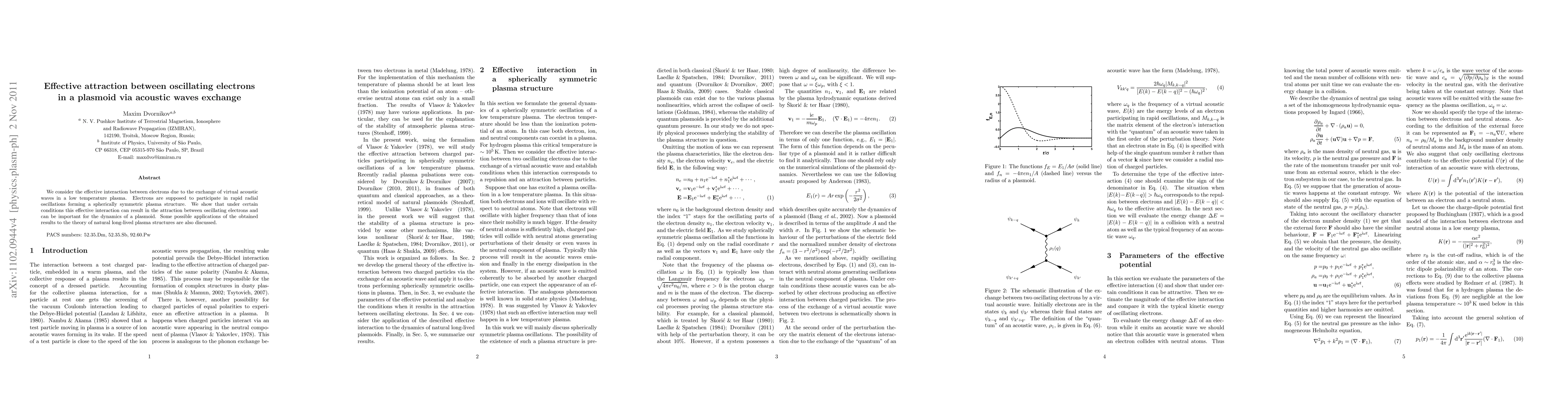 This paper investigates the interaction between oscillating electrons in a low-temperature plasma mediated by virtual acoustic waves, demonstrating that under specific conditions, this interaction can lead to electron attraction, influencing the dynamics of plasmoids. Potential applications to the theory of stable plasma structures are also explored.