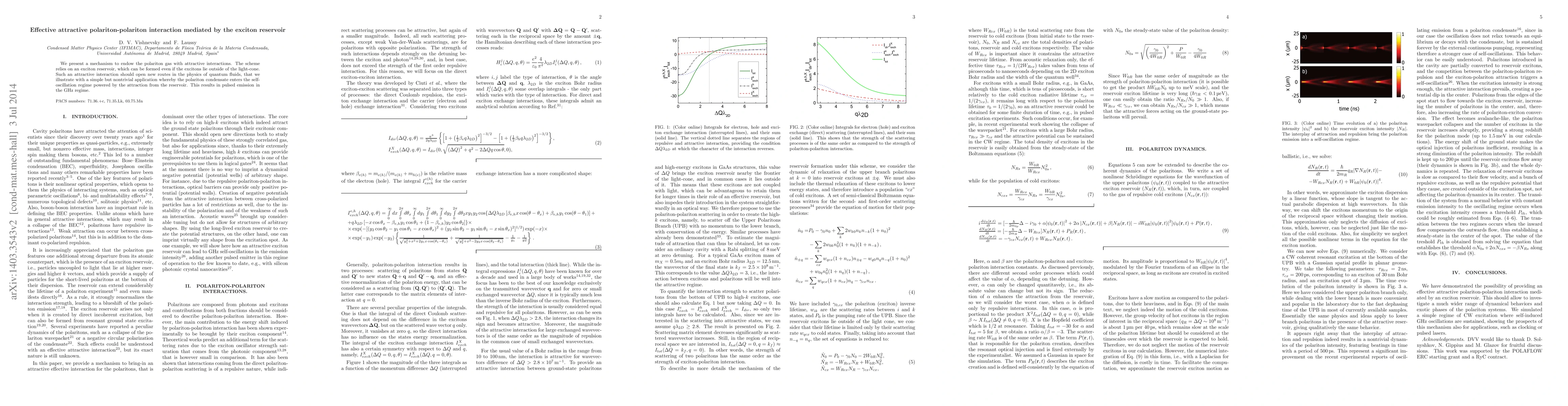 This paper proposes a method to introduce attractive interactions in a polariton gas via an exciton reservoir, enabling the formation of a polariton condensate that enters a self-oscillation regime, resulting in pulsed emission in the GhZ regime. This interaction mechanism could advance the study of quantum fluids.