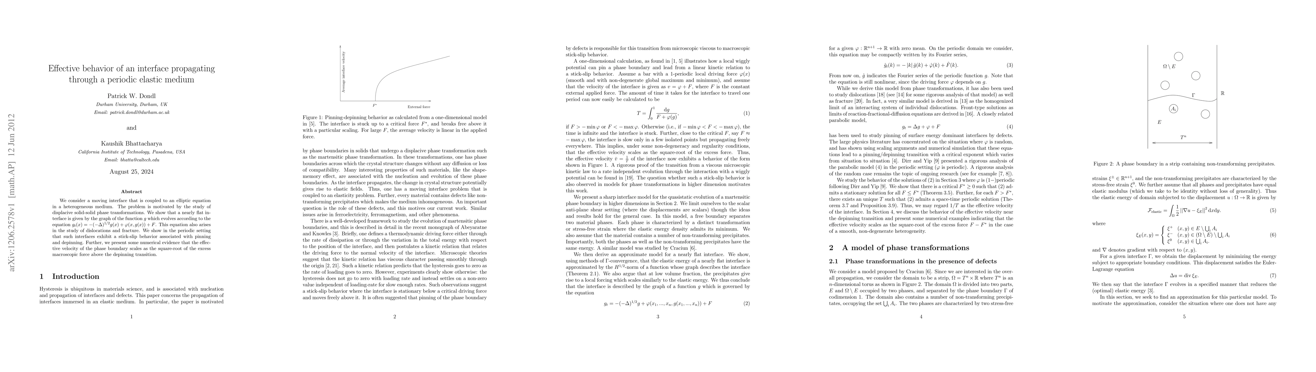 This paper investigates the behavior of a moving interface in a periodic elastic medium, showing that it evolves according to a specific elliptic equation. The study reveals stick-slip behavior and demonstrates that the effective velocity of the phase boundary scales with the square-root of the excess macroscopic force.