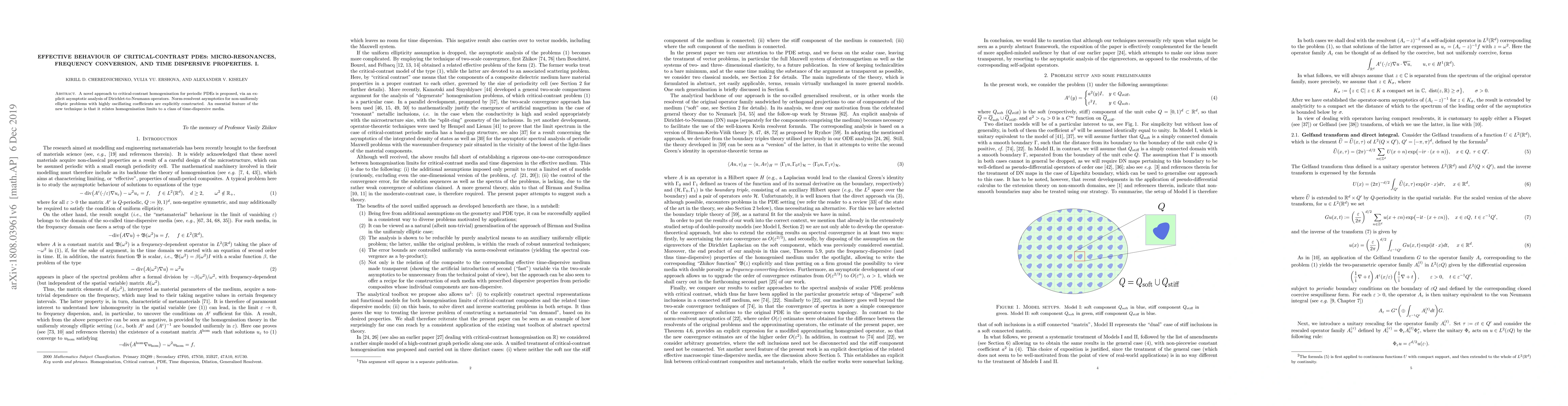 This paper introduces a novel method for critical-contrast homogenisation of periodic PDEs, employing an explicit asymptotic analysis of Dirichlet-to-Neumann operators. It constructs norm-resolvent asymptotics for non-uniformly elliptic problems with highly oscillating coefficients, linking homogenisation limits to time-dispersive media.