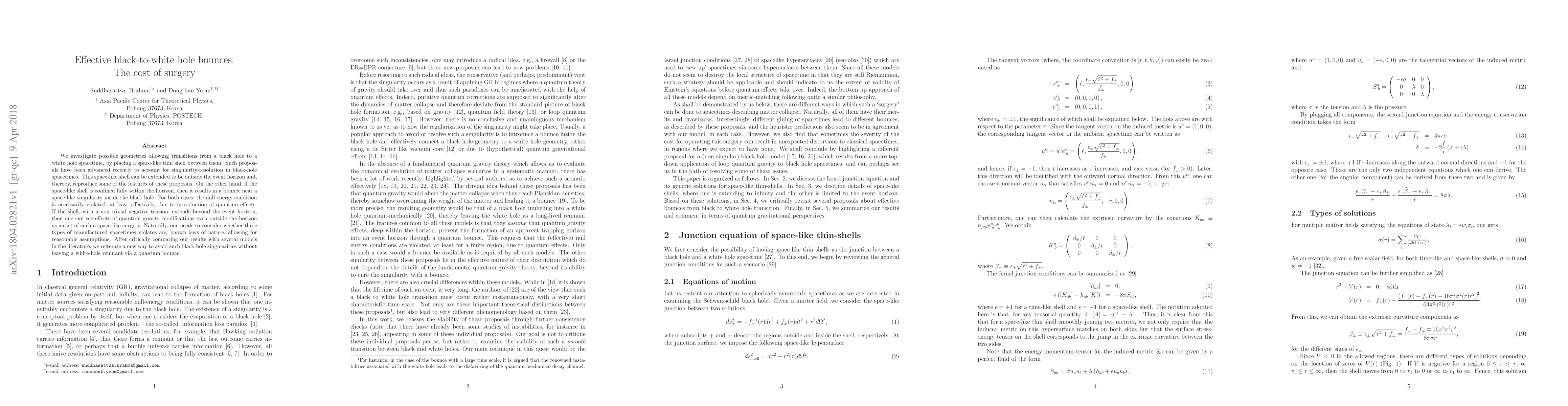 We investigate possible geometries allowing transitions from a black hole to a white hole spacetime, by placing a space-like thin shell between them. Such proposals have been advanced recently to account for singularity-resolution in black-hole spacetimes. This space-like shell can be extended to be outside the event horizon and, thereby, reproduce some of the features of these proposals. On the other hand, if the space-like shell is confined fully within the horizon, then it results in a bounce near a space-like singularity inside the black hole. For both cases, the null energy condition is necessarily violated, at least effectively, due to introduction of quantum effects. If the shell, with a non-trivial negative tension, extends beyond the event horizon, then one can see effects of quantum gravity modifications even outside the horizon as a cost of such a space-like surgery. Naturally, one needs to consider whether these types of manufactured spacetimes violates any known laws of nature, allowing for reasonable assumptions. After critically comparing our results with several models in the literature, we reiterate a new way to avoid such black-hole singularities without leaving a white-hole remnant via a quantum bounce.
