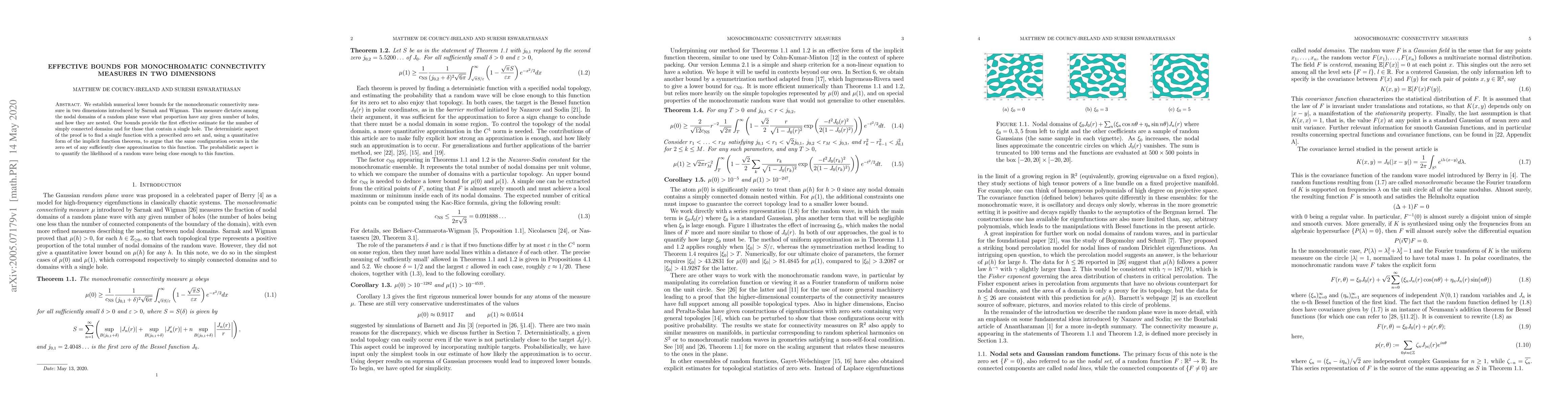 We establish numerical lower bounds for the monochromatic connectivity measure in two dimensions introduced by Sarnak and Wigman. This measure dictates among the nodal domains of a random plane wave what proportion have any given number of holes, and how they are nested. Our bounds provide the first effective estimate for the number of simply connected domains and for those that contain a single hole. The deterministic aspect of the proof is to find a single function with a prescribed zero set and, using a quantitative form of the implicit function theorem, to argue that the same configuration occurs in the zero set of any sufficiently close approximation to this function. The probabilistic aspect is to quantify the likelihood of a random wave being close enough to this function.
