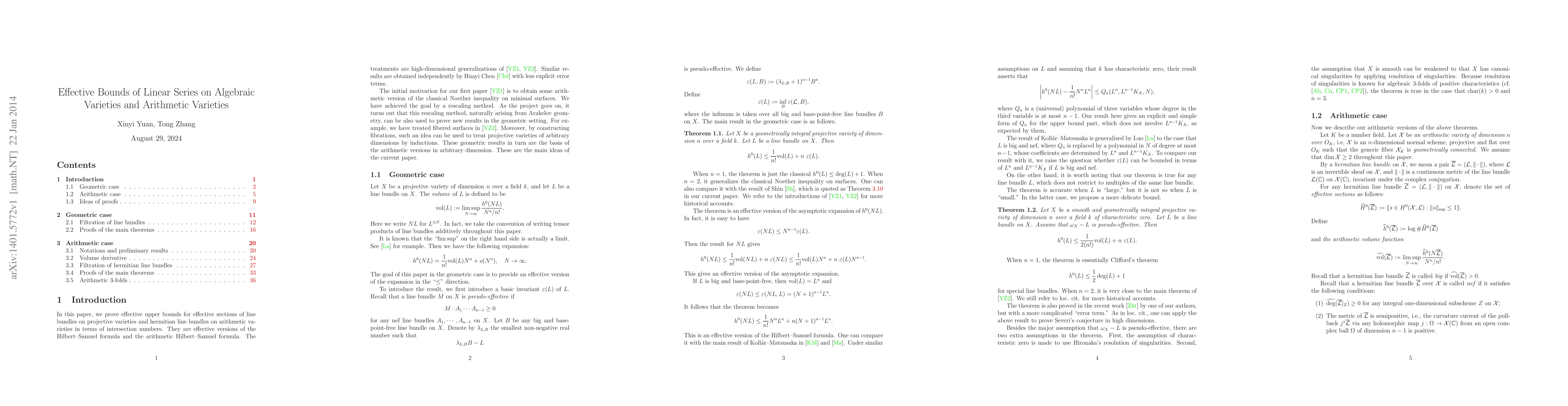 Summary: This paper establishes effective upper bounds for sections of line bundles on projective varieties and hermitian line bundles on arithmetic varieties, providing concrete versions of the Hilbert-Samuel formula and its arithmetic counterpart.