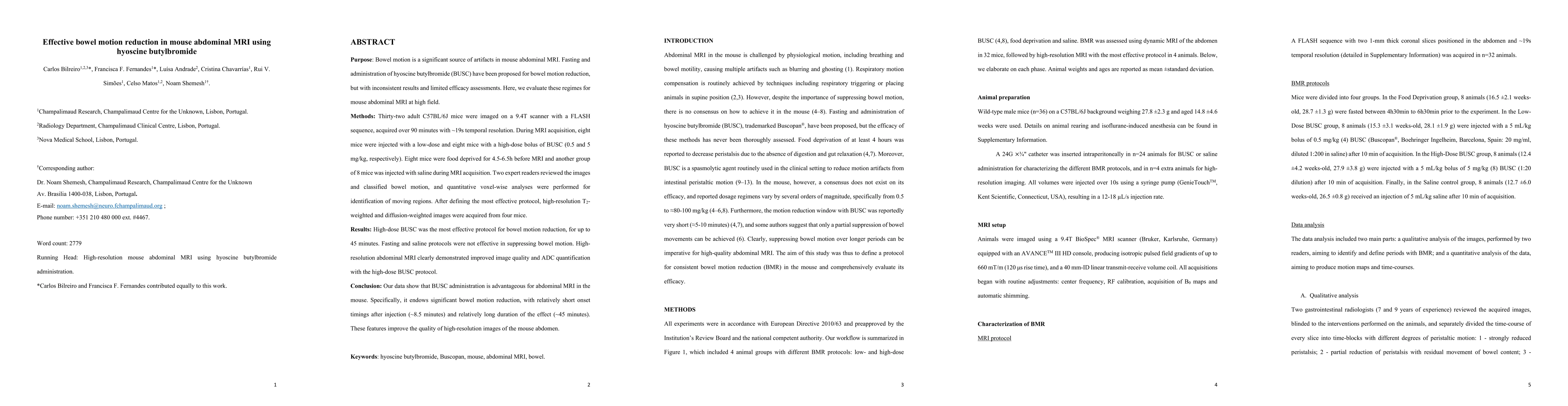 This study evaluates the efficacy of fasting and hyoscine butylbromide (BUSC) administration for bowel motion reduction in mouse abdominal MRI. High-dose BUSC was found to be the most effective, significantly reducing bowel motion for up to 45 minutes, improving image quality and ADC quantification in high-resolution MRI.
