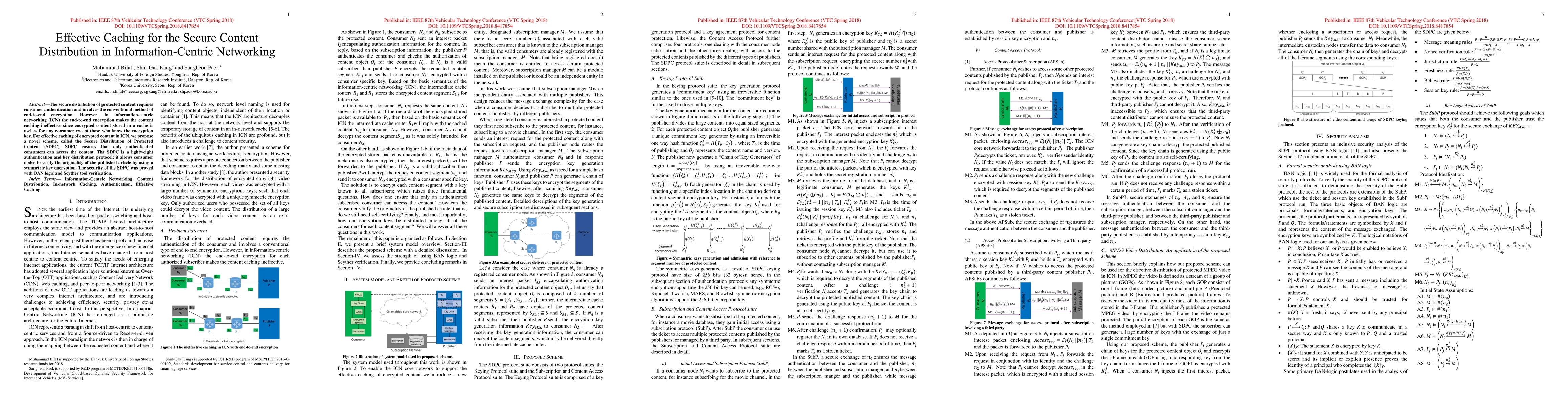 This paper proposes the Secure Distribution of Protected Content (SDPC) scheme to enhance caching efficiency in information-centric networking by enabling authenticated consumers to access encrypted content. The SDPC protocol uses lightweight symmetric key encryption for authentication and key distribution, ensuring security while maintaining effective caching.
