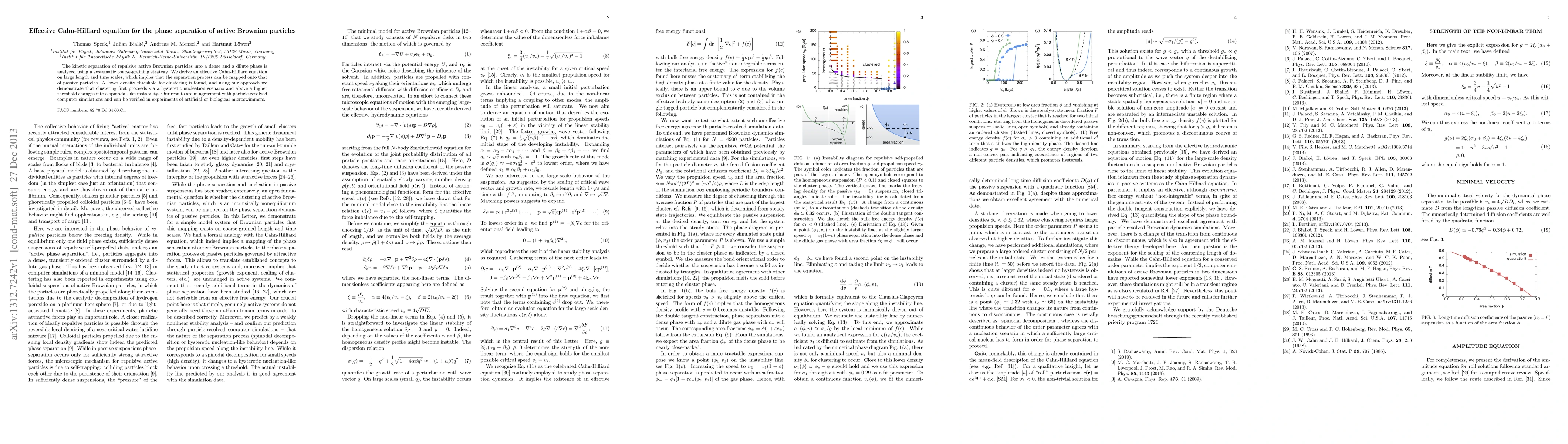 The kinetic separation of repulsive active Brownian particles into a dense and a dilute phase is analyzed using a systematic coarse-graining strategy. We derive an effective Cahn-Hilliard equation on large length and time scales, which implies that the separation process can be mapped onto that of passive particles. A lower density threshold for clustering is found, and using our approach we demonstrate that clustering first proceeds via a hysteretic nucleation scenario and above a higher threshold changes into a spinodal-like instability. Our results are in agreement with particle-resolved computer simulations and can be verified in experiments of artificial or biological microswimmers.