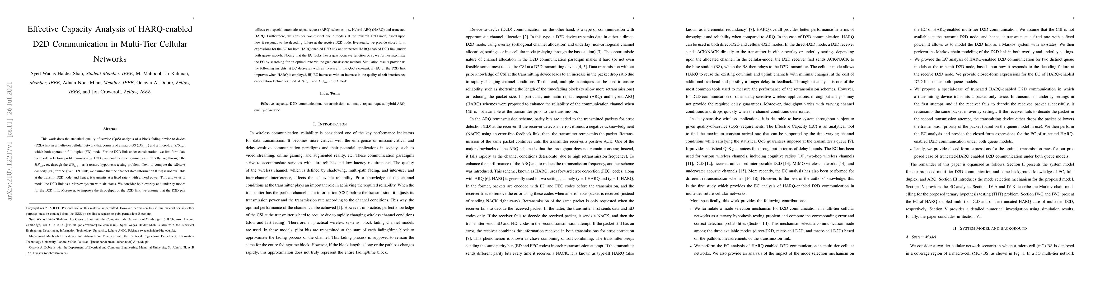 This paper analyzes the effective capacity of a HARQ-enabled D2D link in a multi-tier cellular network with full-duplex macro and micro base stations. It formulates mode selection as a ternary hypothesis testing problem and derives closed-form expressions for effective capacity under different ARQ schemes, optimizing the rate to maximize throughput.
