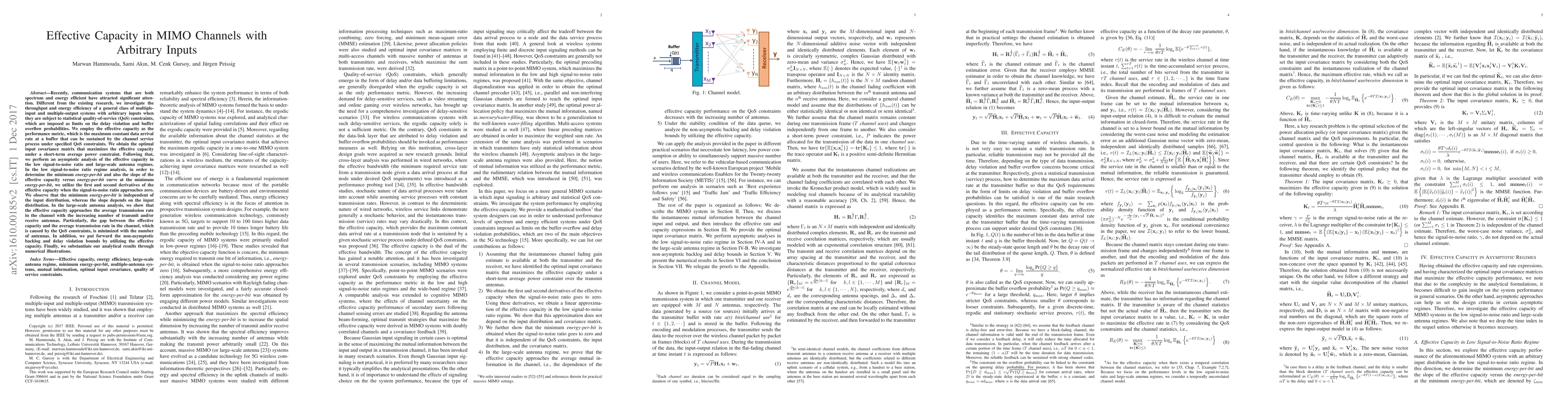 This paper investigates the throughput and energy efficiency of MIMO systems under statistical QoS constraints using effective capacity as the metric. The study determines the optimal input covariance matrix to maximize effective capacity under power constraints and analyzes its behavior in low SNR and large-scale antenna regimes, revealing the independence of minimum energy-per-bit from input distribution and the dependency of the slope on it.
