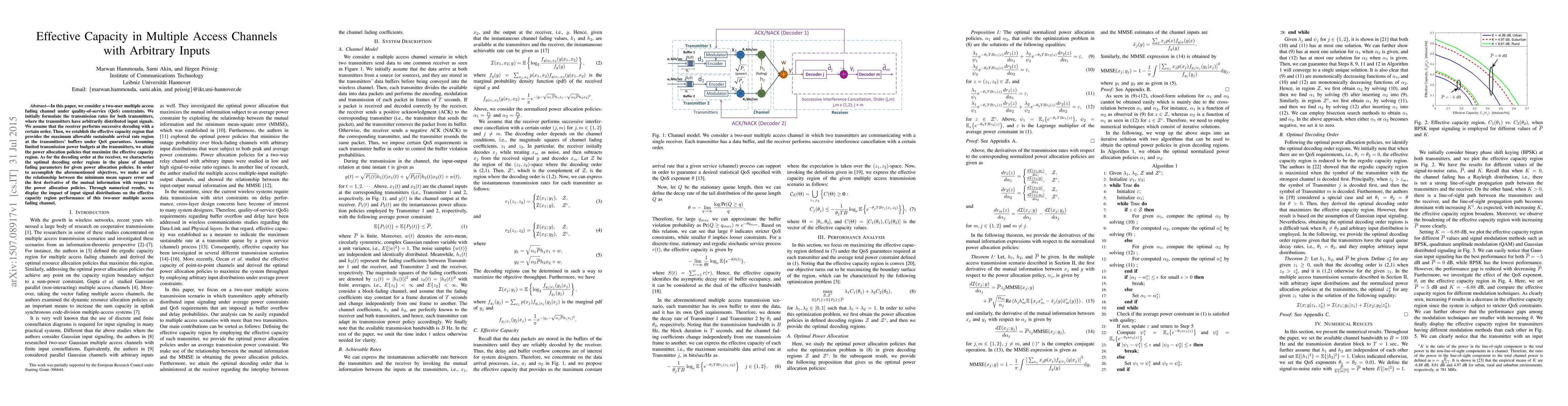 This paper explores the effective capacity in a two-user multiple access fading channel under QoS constraints and arbitrary input signals, establishing the maximum sustainable arrival rate region. It determines optimal power allocation policies and decoding order strategies to maximize effective capacity, using relationships between minimum mean square error and mutual information.