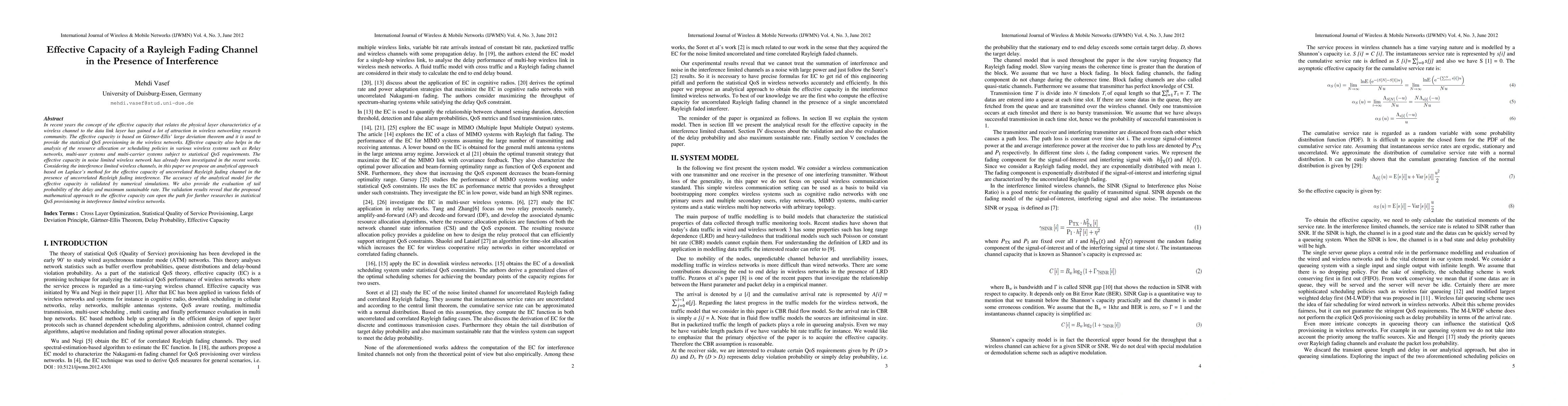 This paper proposes an analytical approach based on Laplace's method to determine the effective capacity of an uncorrelated Rayleigh fading channel under interference, validated by numerical simulations. The study evaluates the tail probability of delay and maximum sustainable rate, demonstrating the potential of the method for statistical QoS provisioning in interference-limited wireless networks.
