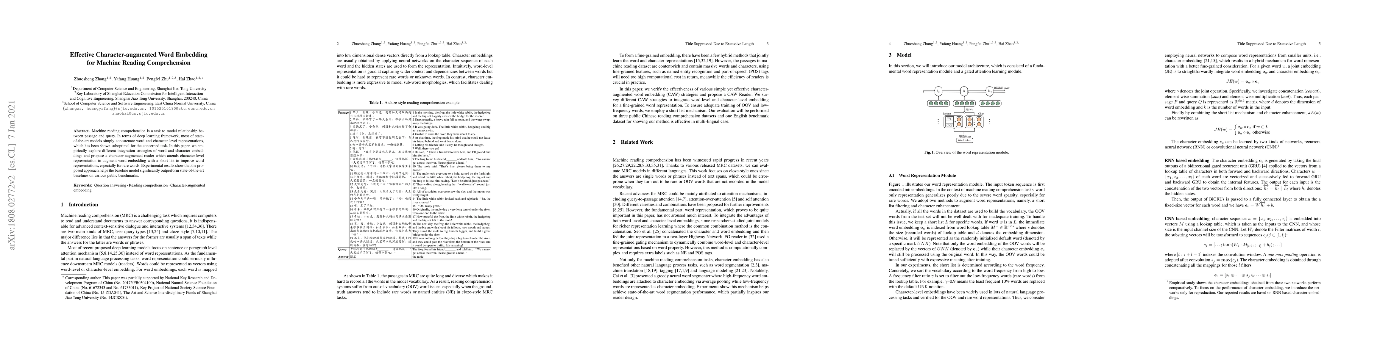 This paper proposes a character-augmented reader that integrates word and character-level representations to enhance word embeddings, particularly for rare words, leading to improved performance in machine reading comprehension tasks. Experimental results demonstrate significant gains over state-of-the-art baselines on multiple benchmarks.