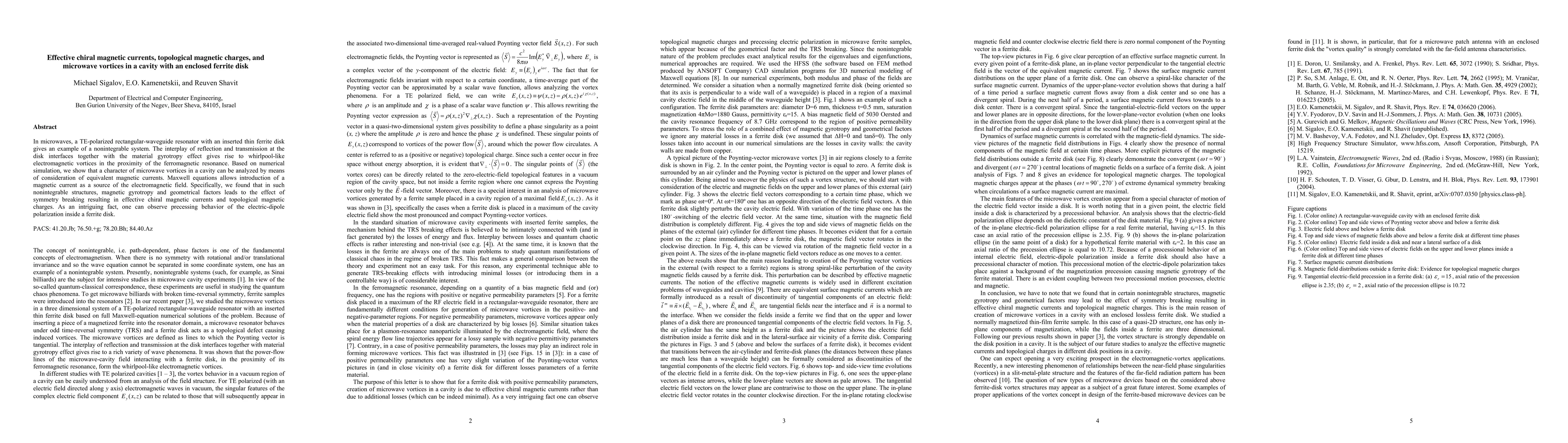 This research reveals how microwave vortices in a resonant cavity with a ferrite disk generate effective chiral magnetic currents and topological magnetic charges due to gyrotropy and geometry, leading to symmetry-breaking effects. Numerical simulations also show dynamic behaviors like precession of electric polarization within the ferrite, offering insights into complex electromagnetic phenomena.