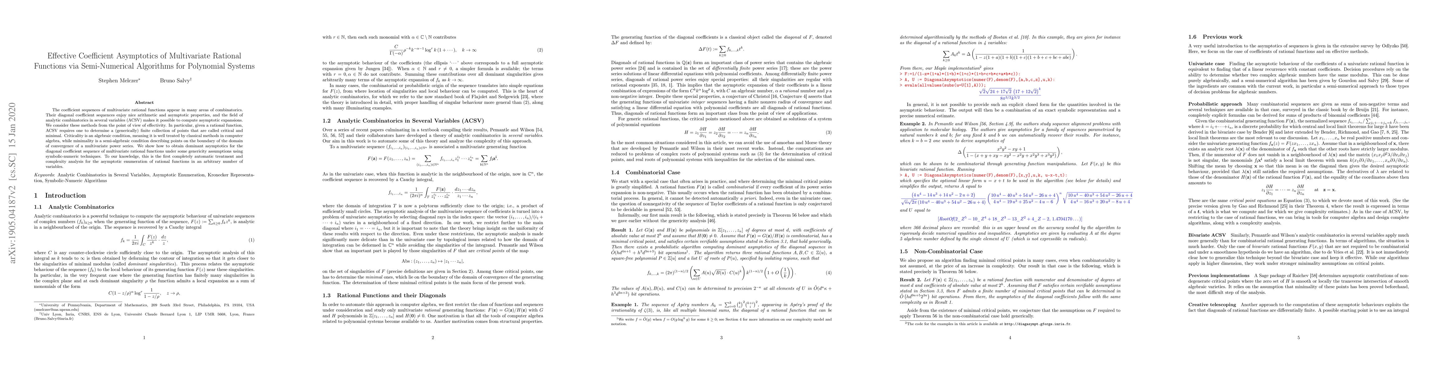The coefficient sequences of multivariate rational functions appear in many areas of combinatorics. Their diagonal coefficient sequences enjoy nice arithmetic and asymptotic properties, and the field of analytic combinatorics in several variables (ACSV) makes it possible to compute asymptotic expansions. We consider these methods from the point of view of effectivity. In particular, given a rational function, ACSV requires one to determine a (generically) finite collection of points that are called critical and minimal. Criticality is an algebraic condition, meaning it is well treated by classical methods in computer algebra, while minimality is a semi-algebraic condition describing points on the boundary of the domain of convergence of a multivariate power series. We show how to obtain dominant asymptotics for the diagonal coefficient sequence of multivariate rational functions under some genericity assumptions using symbolic-numeric techniques. To our knowledge, this is the first completely automatic treatment and complexity analysis for the asymptotic enumeration of rational functions in an arbitrary number of variables.