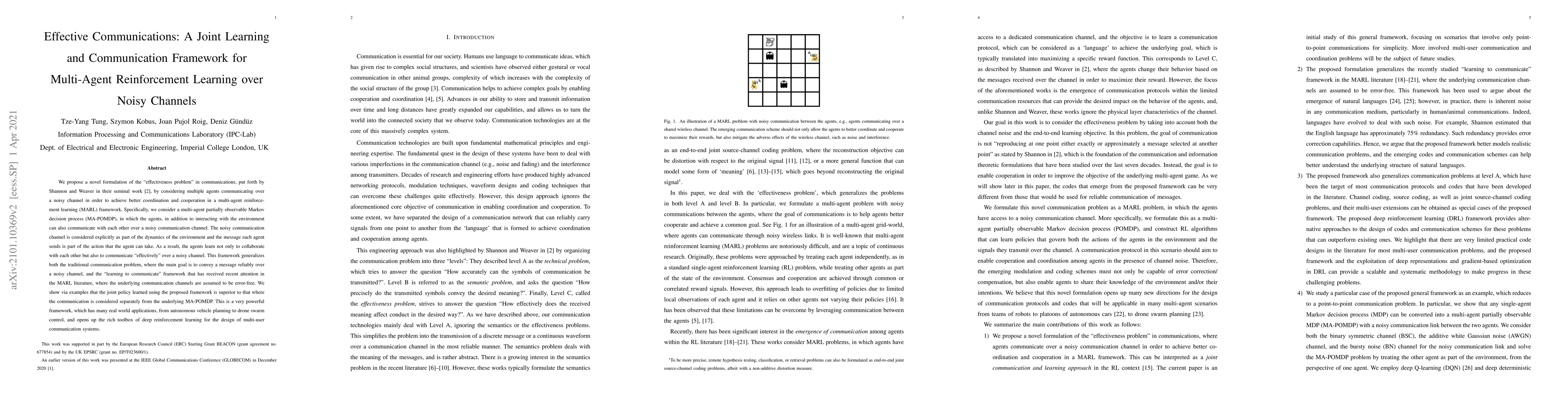 We propose a novel formulation of the "effectiveness problem" in communications, put forth by Shannon and Weaver in their seminal work [2], by considering multiple agents communicating over a noisy channel in order to achieve better coordination and cooperation in a multi-agent reinforcement learning (MARL) framework. Specifically, we consider a multi-agent partially observable Markov decision process (MA-POMDP), in which the agents, in addition to interacting with the environment can also communicate with each other over a noisy communication channel. The noisy communication channel is considered explicitly as part of the dynamics of the environment and the message each agent sends is part of the action that the agent can take. As a result, the agents learn not only to collaborate with each other but also to communicate "effectively" over a noisy channel. This framework generalizes both the traditional communication problem, where the main goal is to convey a message reliably over a noisy channel, and the "learning to communicate" framework that has received recent attention in the MARL literature, where the underlying communication channels are assumed to be error-free. We show via examples that the joint policy learned using the proposed framework is superior to that where the communication is considered separately from the underlying MA-POMDP. This is a very powerful framework, which has many real world applications, from autonomous vehicle planning to drone swarm control, and opens up the rich toolbox of deep reinforcement learning for the design of multi-user communication systems.