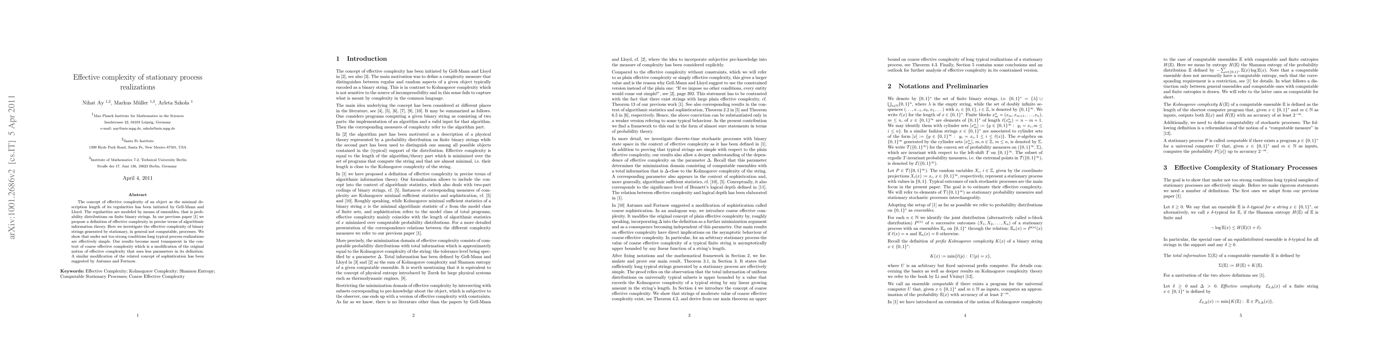 The concept of effective complexity of an object as the minimal description length of its regularities has been initiated by Gell-Mann and Lloyd. The regularities are modeled by means of ensembles, that is probability distributions on finite binary strings. In our previous paper we propose a definition of effective complexity in precise terms of algorithmic information theory. Here we investigate the effective complexity of binary strings generated by stationary, in general not computable, processes. We show that under not too strong conditions long typical process realizations are effectively simple. Our results become most transparent in the context of coarse effective complexity which is a modification of the original notion of effective complexity that uses less parameters in its definition. A similar modification of the related concept of sophistication has been suggested by Antunes and Fortnow.