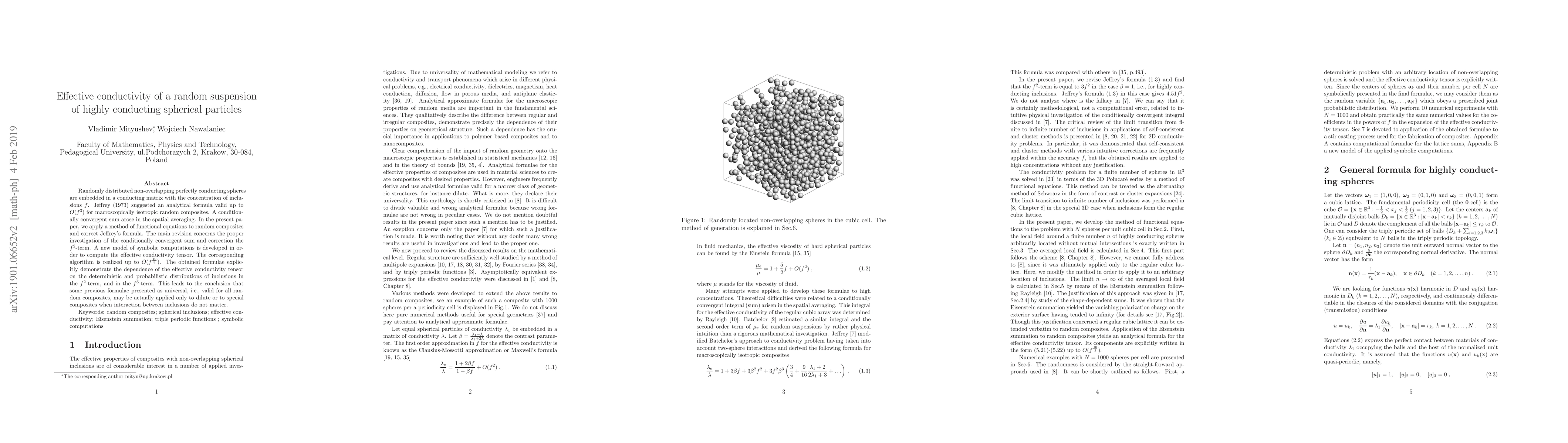 Randomly distributed non-overlapping perfectly conducting spheres are embedded in a conducting matrix with the concentration of inclusions $f$. Jeffrey (1973) suggested an analytical formula valid up to $O(f^3)$ for macroscopically isotropic random composites. A conditionally convergent sum arose in the spatial averaging. In the present paper, we apply a method of functional equations to random composites and correct Jeffrey's formula. The main revision concerns the proper investigation of the conditionally convergent sum and correction the $f^2$-term. A new model of symbolic computations is developed in order to compute the effective conductivity tensor. The corresponding algorithm is realized up to $O(f^{\frac{10}3})$. The obtained formulae explicitly demonstrate the dependence of the effective conductivity tensor on the deterministic and probabilistic distributions of inclusions in the $f^2$-term, and in the $f^3$-term. This leads to the conclusion that some previous formulae presented as universal, i.e., valid for all random composites, may be actually applied only to dilute or to special composites when interaction between inclusions do not matter.