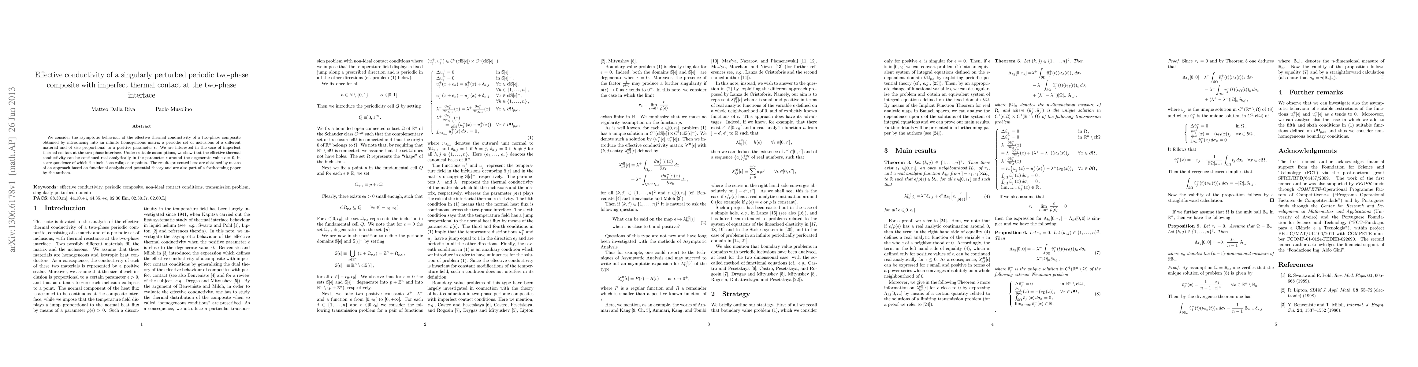 We consider the asymptotic behaviour of the effective thermal conductivity of a two-phase composite obtained by introducing into an infinite homogeneous matrix a periodic set of inclusions of a different material and of size proportional to a positive parameter \epsilon. We are interested in the case of imperfect thermal contact at the two-phase interface. Under suitable assumptions, we show that the effective thermal conductivity can be continued real analytically in the parameter \epsilon around the degenerate value \epsilon=0, in correspondence of which the inclusions collapse to points. The results presented here are obtained by means of an approach based on functional analysis and potential theory and are also part of a forthcoming paper by the authors.