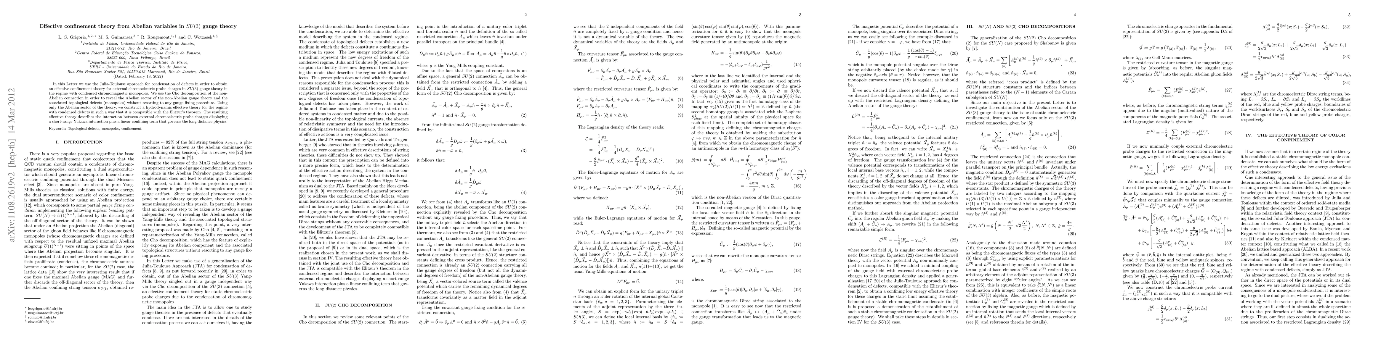 This paper develops an effective confinement theory using the Julia-Toulouse approach for condensed chromomagnetic monopoles in SU(3) gauge theory. It employs the Cho decomposition to focus on the Abelian sector, constructing a hydrodynamic theory compatible with Elitzur's theorem that describes both short-range Yukawa interactions and long-range linear confinement for external chromoelectric charges.