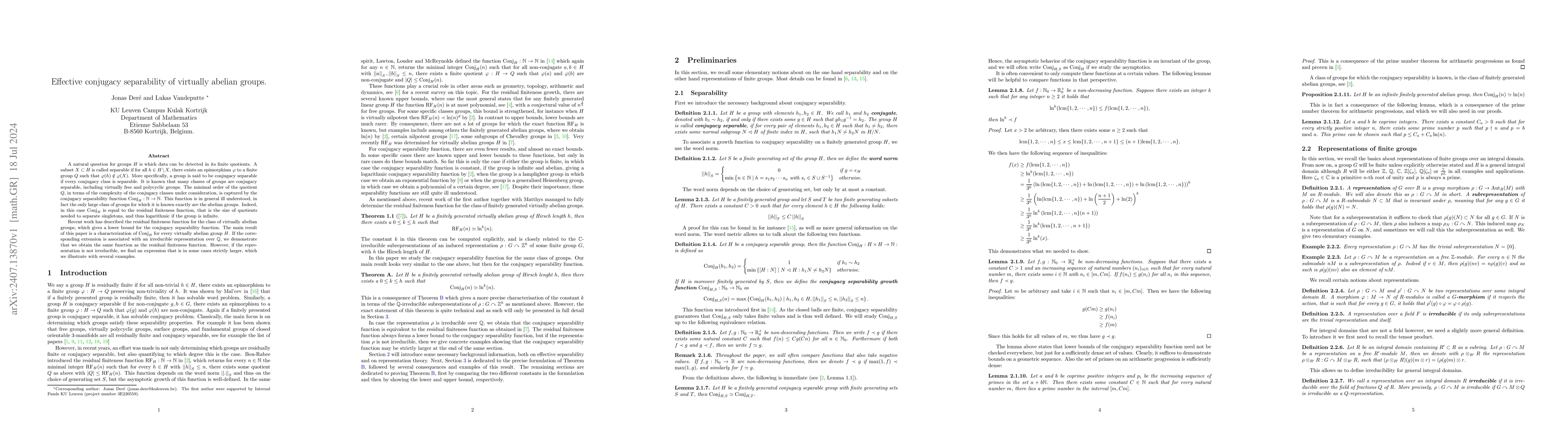 This paper characterizes the conjugacy separability function for virtually abelian groups, showing it aligns with the residual finiteness function when associated with irreducible representations over $\mathbb{Q}$, but diverges for non-irreducible representations, providing illustrative examples.