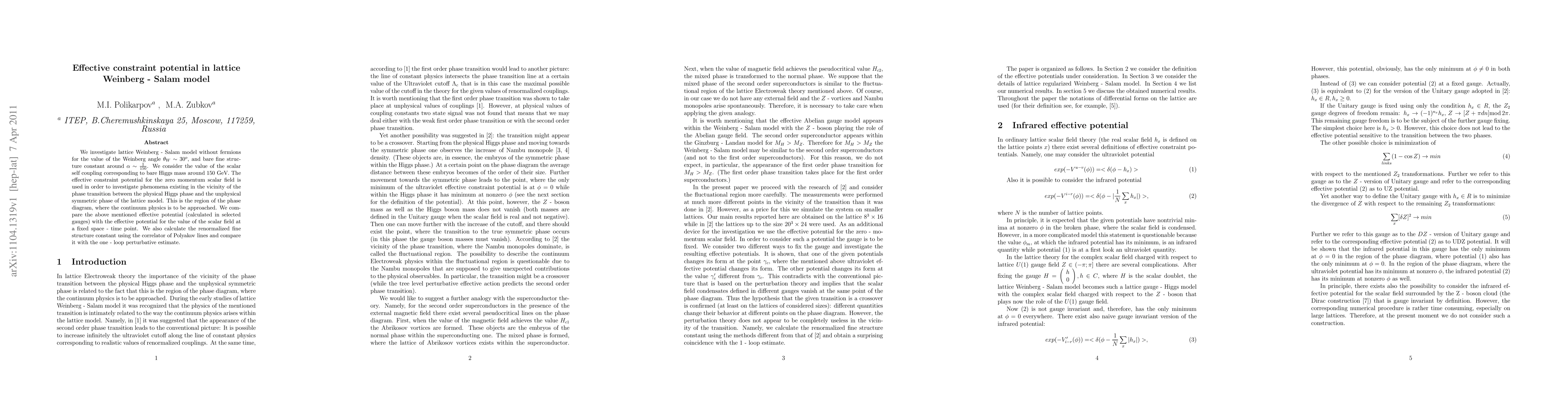 This paper studies the lattice Weinberg-Salam model without fermions, focusing on the effective constraint potential near the phase transition between the physical Higgs phase and the symmetric phase. It compares the effective potential at zero momentum with that at a fixed spacetime point and calculates the renormalized fine structure constant using Polyakov line correlators.