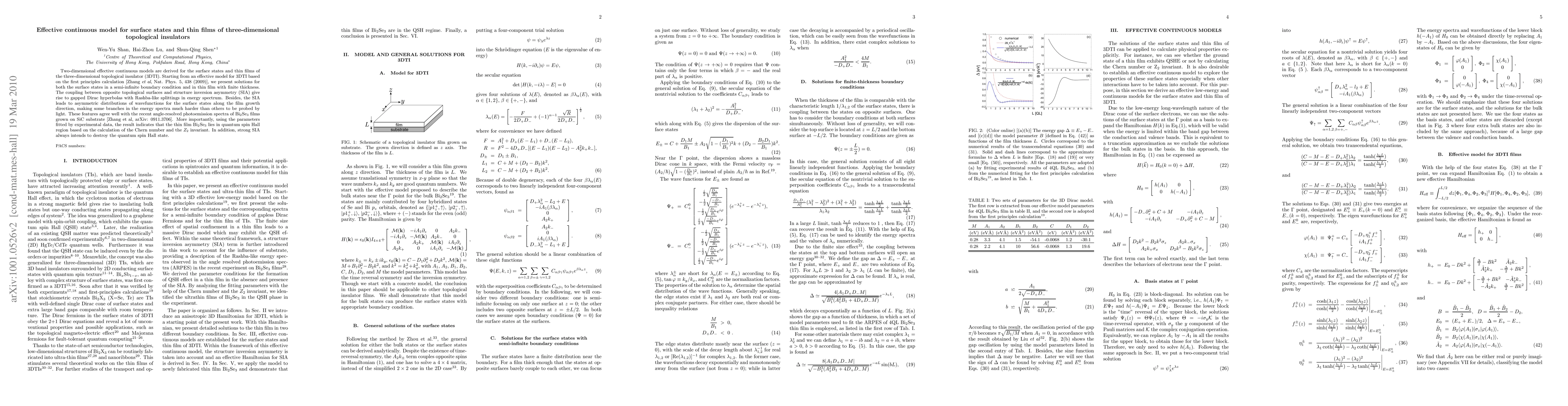This paper derives effective continuous models for surface states and thin films of three-dimensional topological insulators, showing that structure inversion asymmetry leads to gapped Dirac hyperbolas and asymmetric wavefunction distributions. The model fits experimental data to determine parameters, indicating that thin film Bi$_{2}$Se$_{3}$ resides in the quantum spin Hall region, though strong asymmetry can disrupt this state.