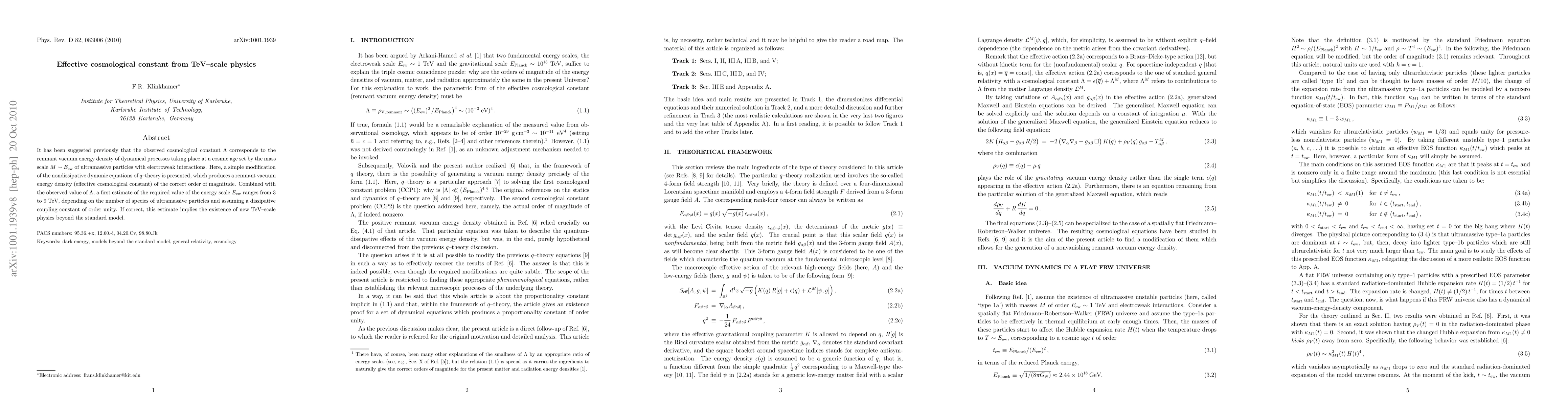 It has been suggested previously that the observed cosmological constant Lambda corresponds to the remnant vacuum energy density of dynamical processes taking place at a cosmic age set by the mass scale M \sim E_{ew} of ultramassive particles with electroweak interactions. Here, a simple modification of the nondissipative dynamic equations of q-theory is presented, which produces a remnant vacuum energy density (effective cosmological constant) of the correct order of magnitude. Combined with the observed value of Lambda, a first estimate of the required value of the energy scale E_{ew} ranges from 3 to 9 TeV, depending on the number of species of ultramassive particles and assuming a dissipative coupling constant of order unity. If correct, this estimate implies the existence of new TeV-scale physics beyond the standard model.