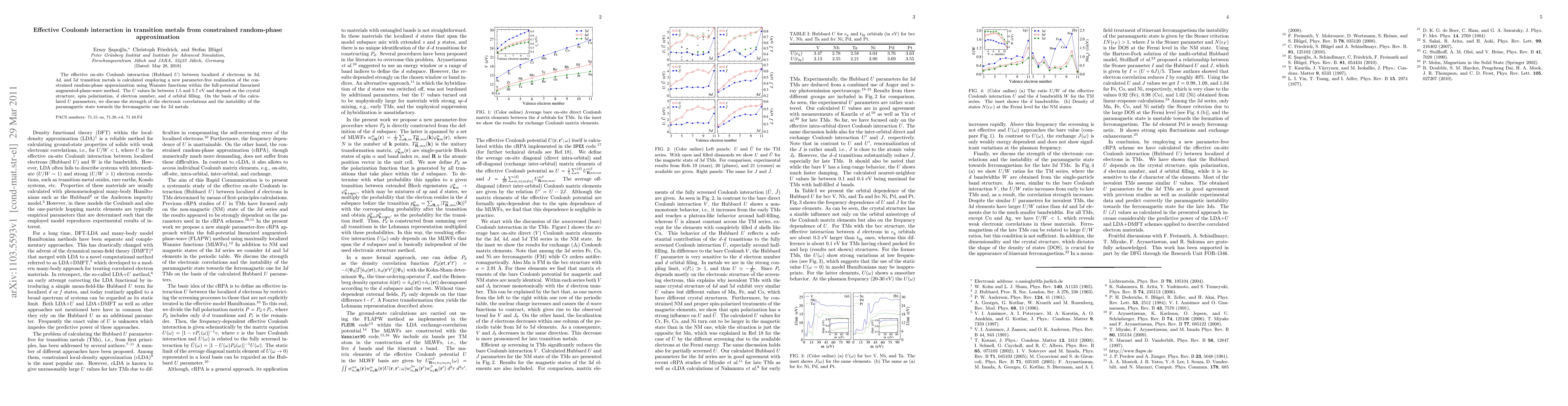 This paper calculates the effective Coulomb interaction (Hubbard $U$) in transition metals using a parameter-free constrained random-phase approximation method. The results show $U$ values between 1.5 and 5.7 eV, influenced by factors like crystal structure and spin polarization, and discuss implications for electronic correlations and magnetic instabilities.