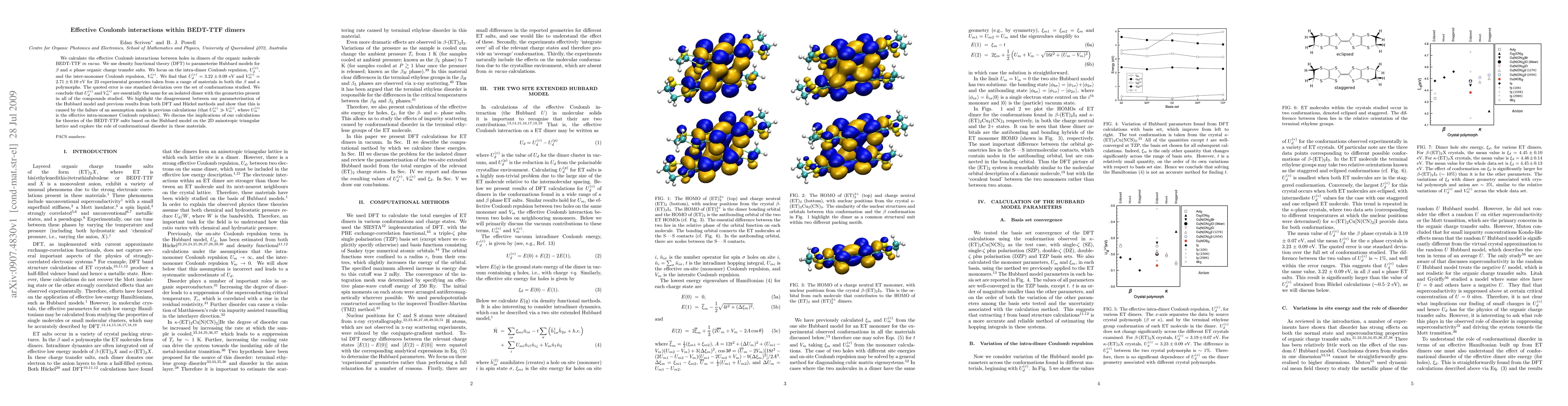 We calculate the effective Coulomb interactions between holes in dimers of the organic molecule BEDT-TTF in vacuo. We use density functional theory (DFT) to parameterise Hubbard models for beta and kappa phase organic charge transfer salts. We focus on the intra-dimer Coulomb repulsion, U_d, and the inter-monomer Coulomb repulsion, V_m. We find that U_d = 3.22 \pm 0.09 eV and V_m = 2.71 \pm 0.10 eV for 23 experimental geometries taken from a range of materials in both polymorphs. The quoted error is one standard deviation over the set of conformations studied. We conclude that U_d and V_m are essentially the same for an isolated dimer with the geometries present in all of the compounds studied. We highlight the disagreement between our parameterisation of the Hubbard model and previous results from both DFT and Huckel methods and show that this is caused by the failure of an assumption made in previous calculations (that U_m >> V_m, where U_m is the effective intra-monomer Coulomb repulsion). We discuss the implications of our calculations for theories of the BEDT-TTF salts based on the Hubbard model on the 2D anisotropic triangular lattice and explore the role of conformational disorder in these materials.