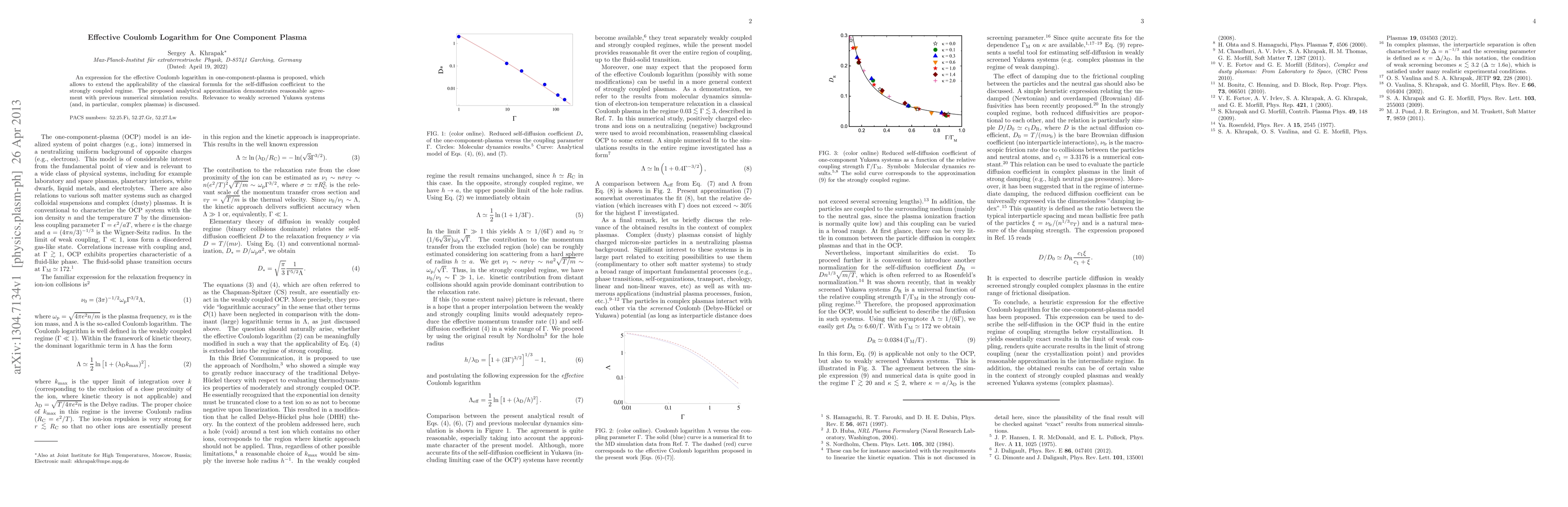 The paper proposes an analytical expression for the effective Coulomb logarithm in one-component plasma, extending the classical formula for self-diffusion to strongly coupled regimes. The new approximation aligns well with previous numerical simulations and has implications for weakly screened Yukawa systems, including complex plasmas.