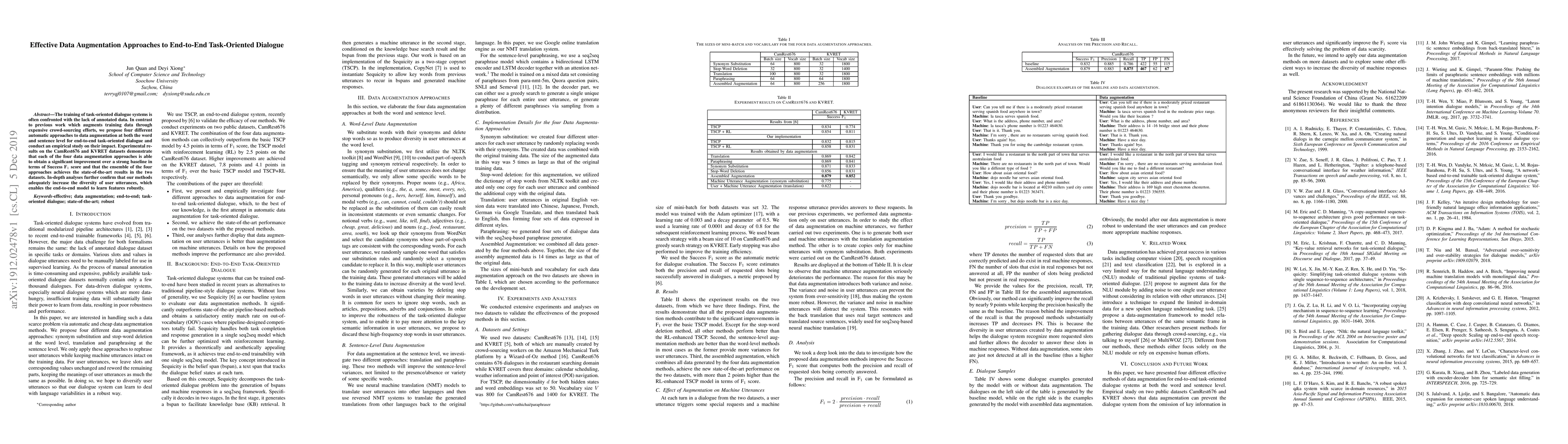 This paper proposes four automatic data augmentation techniques to enhance the training of end-to-end task-oriented dialogue systems, achieving significant improvements over a baseline and state-of-the-art results on two datasets. The ensemble of these methods notably increases utterance diversity, leading to more robust model learning.