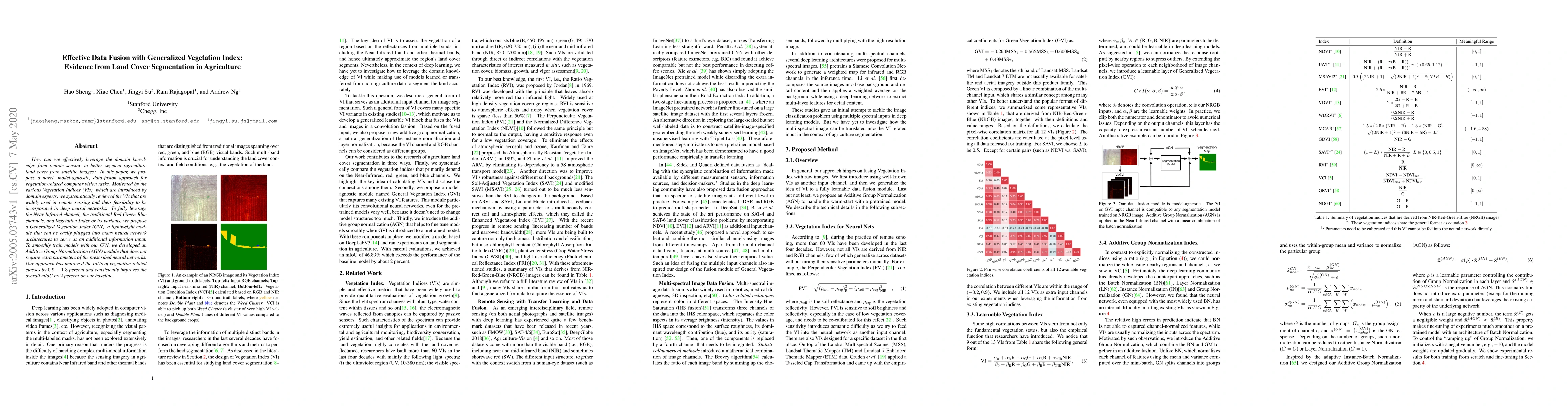 How can we effectively leverage the domain knowledge from remote sensing to better segment agriculture land cover from satellite images? In this paper, we propose a novel, model-agnostic, data-fusion approach for vegetation-related computer vision tasks. Motivated by the various Vegetation Indices (VIs), which are introduced by domain experts, we systematically reviewed the VIs that are widely used in remote sensing and their feasibility to be incorporated in deep neural networks. To fully leverage the Near-Infrared channel, the traditional Red-Green-Blue channels, and Vegetation Index or its variants, we propose a Generalized Vegetation Index (GVI), a lightweight module that can be easily plugged into many neural network architectures to serve as an additional information input. To smoothly train models with our GVI, we developed an Additive Group Normalization (AGN) module that does not require extra parameters of the prescribed neural networks. Our approach has improved the IoUs of vegetation-related classes by 0.9-1.3 percent and consistently improves the overall mIoU by 2 percent on our baseline.