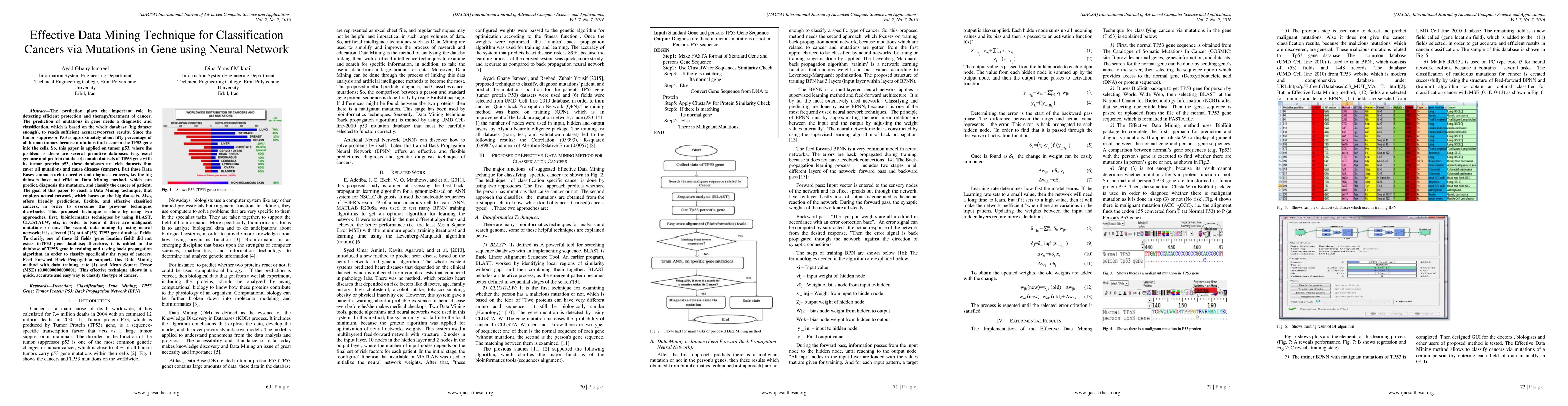The prediction plays the important role in detecting efficient protection and therapy of cancer. The prediction of mutations in gene needs a diagnostic and classification, which is based on the whole database (big dataset), to reach sufficient accuracy results. Since the tumor suppressor P53 is approximately about fifty percentage of all human tumors because mutations that occur in the TP53 gene into the cells. So, this paper is applied on tumor p53, where the problem is there are several primitive databases (excel database) contain datasets of TP53 gene with its tumor protein p53, these databases are rich datasets that cover all mutations and cause diseases (cancers). But these Data Bases cannot reach to predict and diagnosis cancers, i.e. the big datasets have not efficient Data Mining method, which can predict, diagnosis the mutation, and classify the cancer of patient. The goal of this paper to reach a Data Mining technique, that employs neural network, which bases on the big datasets. Also, offers friendly predictions, flexible, and effective classified cancers, in order to overcome the previous techniques drawbacks. This proposed technique is done by using two approaches, first, bioinformatics techniques by using BLAST, CLUSTALW, etc, in order to know if there are malignant mutations or not. The second, data mining by using neural network; it is selected (12) out of (53) TP53 gene database fields. To clarify, one of these 12 fields (gene location field) did not exists in TP53 gene database; therefore, it is added to the database of TP53 gene in training and testing back propagation algorithm, in order to classify specifically the types of cancers. Feed Forward Back Propagation supports this Data Mining method with data training rate (1) and Mean Square Error (MSE) (0.00000000000001). This effective technique allows in a quick, accurate and easy way to classify the type of cancer.