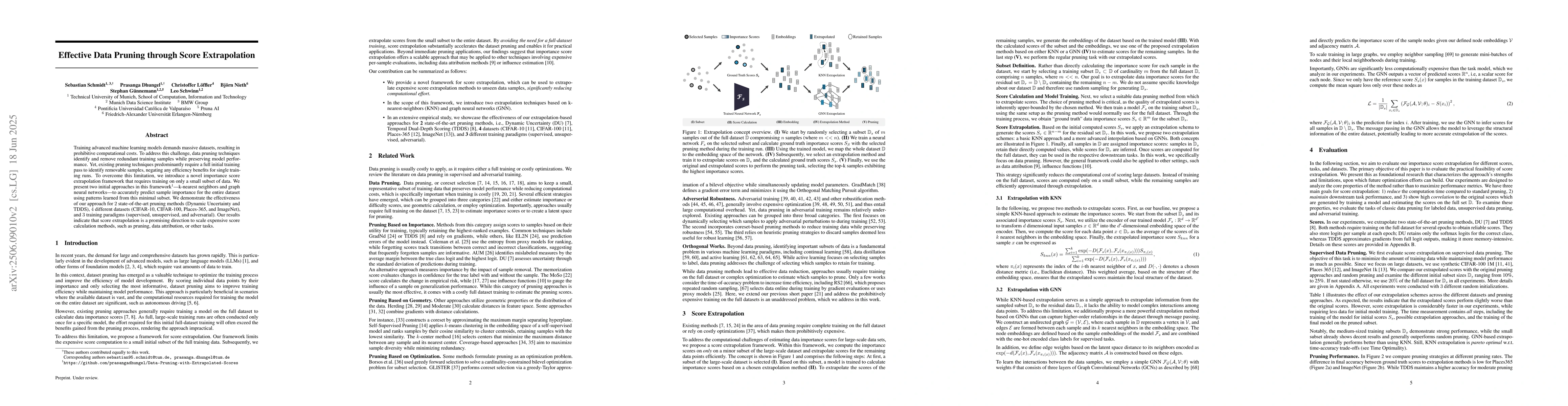 Training advanced machine learning models demands massive datasets, resulting in prohibitive computational costs. To address this challenge, data pruning techniques identify and remove redundant training samples while preserving model performance. Yet, existing pruning techniques predominantly require a full initial training pass to identify removable samples, negating any efficiency benefits for single training runs. To overcome this limitation, we introduce a novel importance score extrapolation framework that requires training on only a small subset of data. We present two initial approaches in this framework - k-nearest neighbors and graph neural networks - to accurately predict sample importance for the entire dataset using patterns learned from this minimal subset. We demonstrate the effectiveness of our approach for 2 state-of-the-art pruning methods (Dynamic Uncertainty and TDDS), 4 different datasets (CIFAR-10, CIFAR-100, Places-365, and ImageNet), and 3 training paradigms (supervised, unsupervised, and adversarial). Our results indicate that score extrapolation is a promising direction to scale expensive score calculation methods, such as pruning, data attribution, or other tasks.