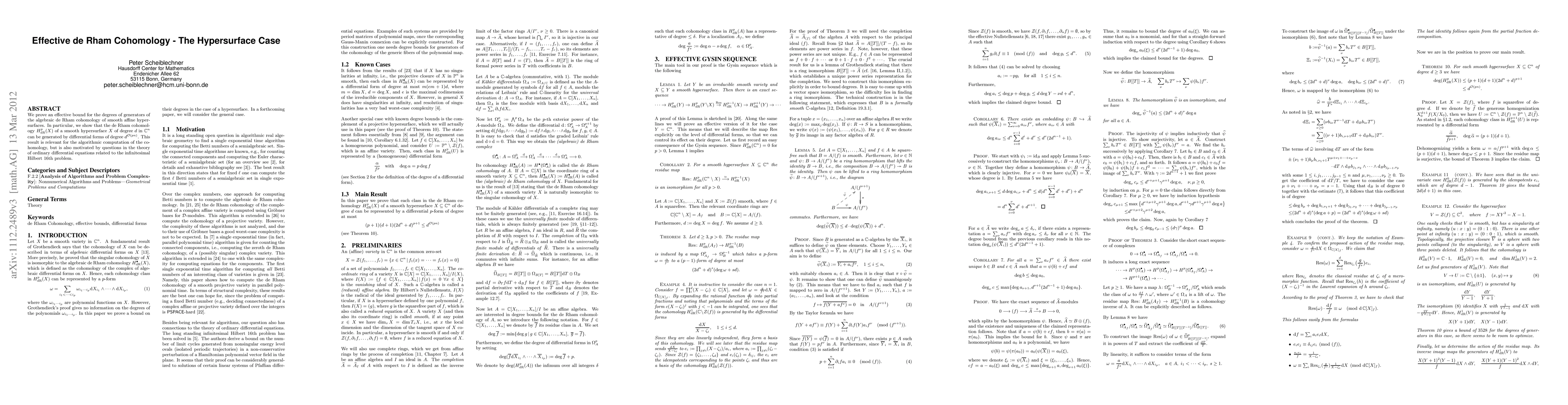 Researchers prove that the de Rham cohomology of smooth hypersurfaces can be generated by differential forms with degrees bounded by $d^{O(pn)}$, improving computational capabilities for solving differential equations.
