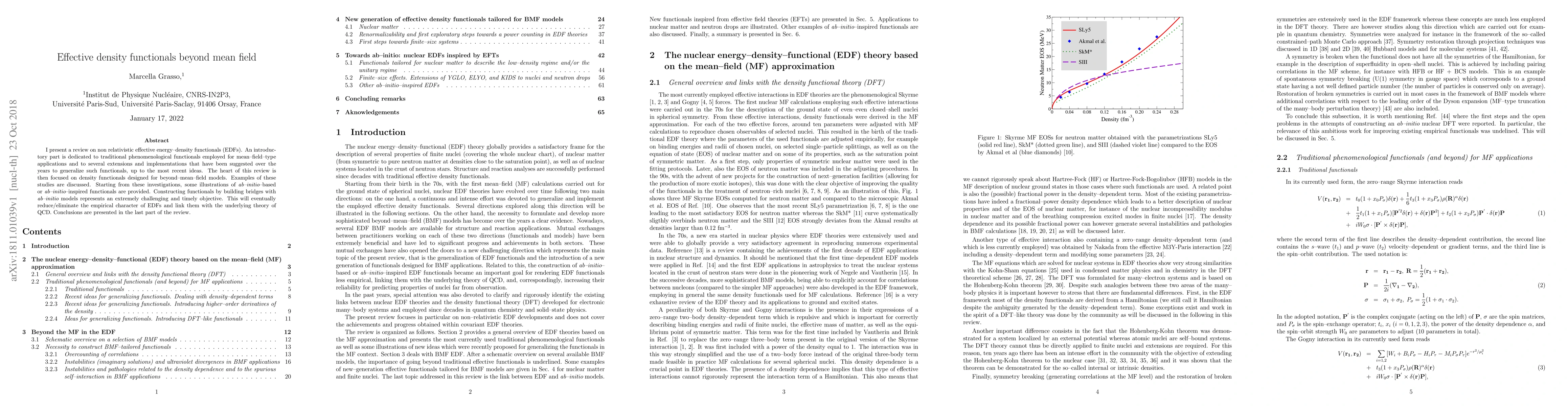 I present a review on non relativistic effective energy--density functionals (EDFs). An introductory part is dedicated to traditional phenomenological functionals employed for mean--field--type applications and to several extensions and implementations that have been suggested over the years to generalize such functionals, up to the most recent ideas. The heart of this review is then focused on density functionals designed for beyond--mean--field models. Examples of these studies are discussed. Starting from these investigations, some illustrations of {\it{ab--initio}}--based or {\it{ab--initio}}--inspired functionals are provided. Constructing functionals by building bridges with {\it{ab--initio}} models represents an extremely challenging and timely objective. This will eventually reduce/eliminate the empirical character of EDFs and link them with the underlying theory of QCD. Conclusions are presented in the last part of the review.