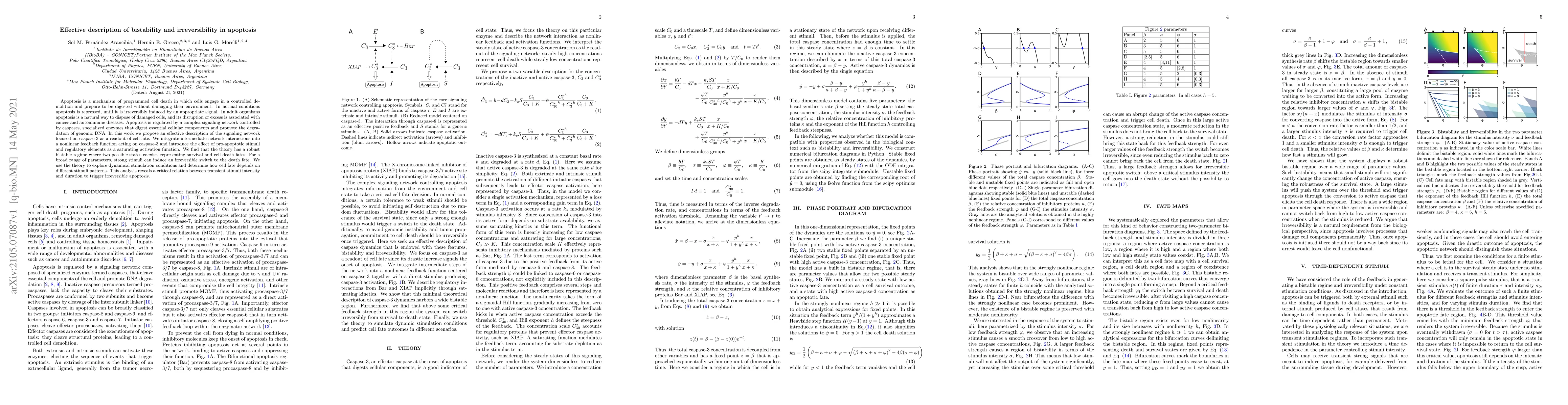 Apoptosis is a mechanism of programmed cell death in which cells engage in a controlled demolition and prepare to be digested without damaging their environment. In normal conditions apoptosis is repressed, until it is irreversibly induced by an appropriate signal. In adult organisms apoptosis is a natural way to dispose of damaged cells, and its disruption or excess is associated with cancer and autoimmune diseases. Apoptosis is regulated by a complex signaling network controlled by caspases, specialized enzymes that digest essential cellular components and promote the degradation of genomic DNA. In this work we propose an effective description of the signaling network focused on caspase-3 as a readout of cell fate. We integrate intermediate network interactions into a nonlinear feedback function acting on caspase-3 and introduce the effect of pro-apoptotic stimuli and regulatory elements as a saturating activation function. We find that the theory has a robust bistable regime where two possible states coexist, representing survival and cell death fates. For a broad range of parameters, strong stimuli can induce an irreversible switch to the death fate. We use the theory to explore dynamical stimulation conditions and determine how cell fate depends on different stimuli patterns. This analysis reveals a critical relation between transient stimuli intensity and duration to trigger irreversible apoptosis.